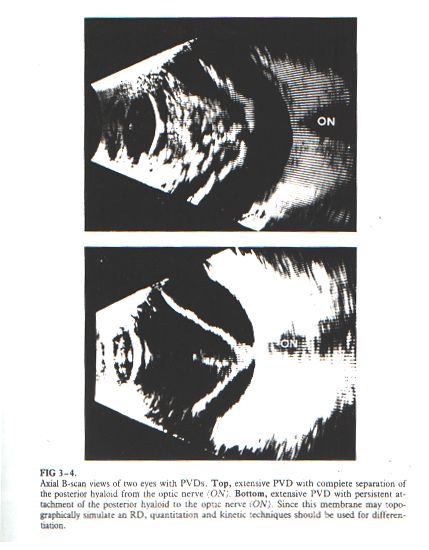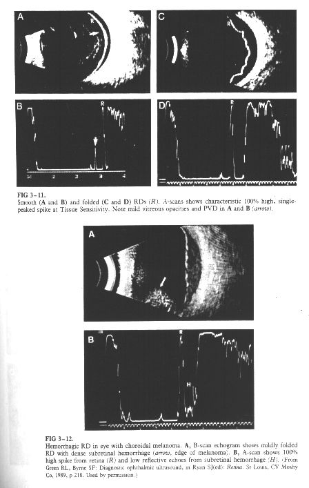 A超检查在鉴别玻璃体与视网膜时很有用的。这一方法是基于发现视网膜和玻璃体膜在周边部具有不同的反射率。RD保持很高的反射率,而PVD在它附着于周边部眼底时反射率降低。唯一的例外是在下方周边部,该处的玻璃体膜与视网膜相似,有很高的反射率。