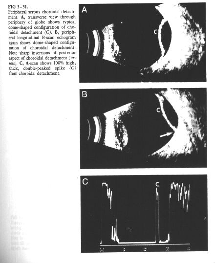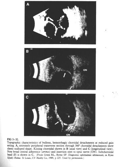 B超,典型的CD呈光滑、增厚、园顶状的膜,位于周边部眼底。在动态检查时没有什么后运动。当CD很浅时,则显得较平坦。当CD 为360度时,以横向检查时,多外泡状隆起就形成贝壳形态。这在CD的诊断上具有特征性的体征。如果脱离明显呈泡状(接吻状),它们会附着于视盘边缘,但不会直接附着于视盘上。一般情况下,周边部浆液性的CD只向后扩展到赤道部。而出血性的CD可通过各种途径扩展到后极部。在泡状CD中,可以发现细条索从脱离的脉络膜内表面伸至巩膜,这很可能表示涡状静脉或神经。CD 可向前扩展到睫状体。当脱离很浅,并扩展到360度时,它们就可能不呈贝壳状,因此就容易与RD相混淆。但应注意的是非牵拉性RD如此广泛,只位于前部是很少见的。