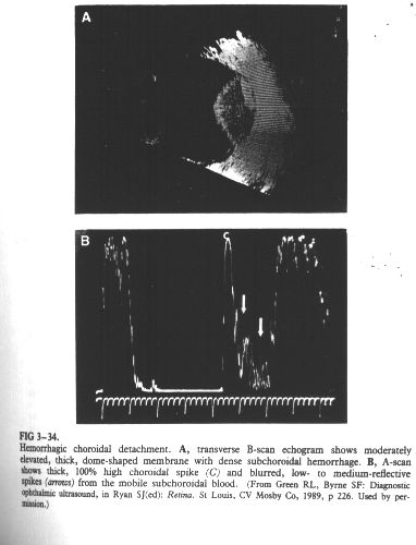 如果出血或其他物质聚集于脉络膜下空间时,在B和A超上可以注意这一区域的回声。局限的CD很像黑色素瘤,但通过注意到脉络膜下间质有液体血存在或通过随诊常可加以鉴别。有兴趣的是泡状CD可同时有脉络膜肿瘤。