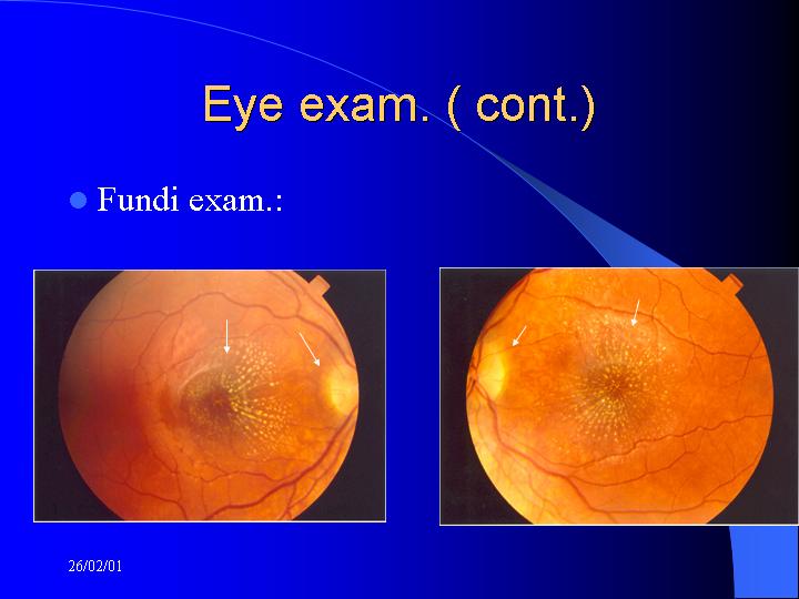 Further History about this child: K.R.’s family has 2 cats and 3 kittens She had close contact the cats and kittens prior to her illness No recall of being scratched by cat, or kittens Diagnosis ? Serum Bartonella Henselae titre( IgG 1024) highly positive. Bilateral Neuroretinitis associated with Cat Scratch Disease Treatment ? Discharge & discontinued all medications Ophthalmology R/V 4 weeks later AKH 6 weeks later Systemically well VA: OD 6/9; OS 6/12+ Fundi exam.: Any changes in the discs & macula ? Discussion Leber’s Idiopathic Stellate Neuroretinitis. 1916. Unilateral Stellate macular exudates Unknown etiology Spontaneous resolution Dreyer et al 1984; modified the terminology of LISN, suggesting a heterogeneous group of conditions can cause similar clinical pictures. He also pointed out that it can be bilateral.many of Leber’s cases may indeed caused by CSD. Discussion ( cont.) Secondary causes of Neuroretinitis: Viral:hepatitis B,HSV,HZV,EBV influenza Bacterial:Bartonella(CSD),TB,Syphilis,lyme disease Fungi:histoplasmosis Parasites & protozoa: toxoplasmosis Others: sarcoidosis, Behcets disease Most common: Cat scratch disease Toxoplasmosis Syphilis Lyme disease Neuroretinitis & CSD Wear et al. 1983, indicated the causative agent of CSD being Gram –ve Bacilli Sweeney and Drance.1990 first described Neuroretinitis caused by CSD Regenry et al. 1992, found high antibody titres (>1:64) to Bartonella henselae in 36 of 41 patients with CSD Serologic evidence of CSD in Neuroretinitis 64.3% (Eric Suhler, Ophthalmology vol 107,No5 2000) Ocular manifestations of CSD Parinaud’s oculoglandular syndrome Fever Granulomatous conjunctivitis Regional lymphadenopathy Neuroretinitis Loss of vision. 6/9 to PL Disc swelling Macular star Focal infarct Often unilateral, but can be bilateral Ocular manifestations of CSD Optic neuritis/papillitis Uveitic syndromes Vitritis Acute multifocal inner retinitis,or retinal white dot syndrome Retinitis Choroiditis Ocular manifestations of CSD Retinovascular syndromes BRVO,BRAO Retinal vasculitis Peripapillary angiomatosis Others. Vf defects, ocular motor palsy Ocular features of AIDS-associated CSD Bacillary angiomatosis in conj & retina