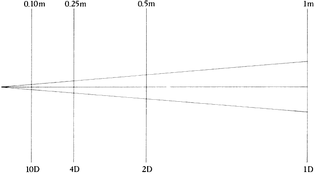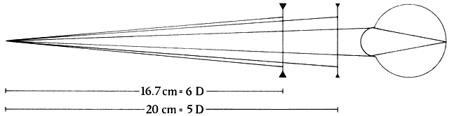 Light rays originating from a point more than6 meters in front of the eye are considered for practical purposes to be parallel on entering the pupil. At any point closer to the light source, the rays are said to have vergence, which is measured in diopters. The vergence of a light ray is equal to the reciprocal of its distance, in meters, from its point of origin. Thus, the vergence of light rays at a given point measured in diopters is inversely proportional to the distance from the focal point of those rays. This focal point may be in front of or behind a given reference point, resulting in divergent (i.e., minus vergence) or convergent (i.e., plus vergence) light rays, respectively. The divergence of light rays20 cm from an object of regard with a vergence of-5.0 D is 10 times greater than the divergence of light from the same object at 200 cm with a vergence of -0.5 D (Fig. 2).