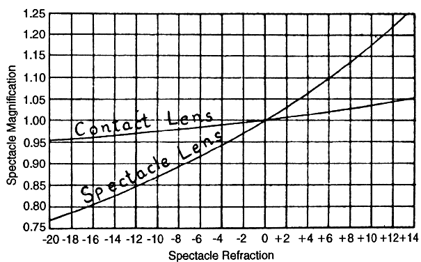 A minus lens diverges parallel rays of light. Parallel rays of light entering a -2.0-D lens have a vergence of -2.0 D on leaving the lens, as though the source of the light rays were 50 cm in front of the lens. The optical correction of myopia is accomplished by interposing a minus lens between the cornea and the far (or focal) point of the eye so that the focal point of the lens coincides with the far point (or focal point) of the eye (Fig. 3). The closer the minus lens is placed toward the far point, the stronger it must be. Conversely, the closer the minus lens is placed toward the eye, the weaker the lens required to correct the myopia. To minimize optical disadvantages, the minus lens spectacles should be fitted as close to the eyes as possible. The higher the degree of myopia, the greater the optical benefits of a reduced vertex distance (i.e., the distance between the corneal surface and the lens). It is important to reduce vertex distance when refracting patients with moderate to high myopia (greater than 5 D) and to note this measurement on the spectacle prescription. Minus lens design affects the position of its principal planes. The biconcave lens of equal curvatures has its principal planes between its two surfaces. The meniscus lens, which has one surface convex and the other concave, has its principal planes toward the side of the lens on which the minus power is present. By placing its concave surface toward the eye, the effective vertex distance with the latter type of lens is decreased, which can have definite optical advantages. In the past, meniscus lenses of increasingly stronger base curves had thicker edges, were heavier, produced bothersome image changes, and were cosmetically less acceptable. Newer lenses of higher refractive index, manufactured in both glass and plastic, can now be made in aspheric single vision and aspheric progressive (multifocal) spectacles. Aspheric lenses for myopic corrections have a thinner edge for improved cosmesis and provide superior optics. When viewing through aspheric spectacles off the optical axis, there is less distortion, improved visual acuity, less chromatic aberration, and, in the case with the aspheric surface on the back of the lenses, an enlarged visual field. IMAGE MINIFICATION Figure 4 shows the effect of minus lenses on image size. The angle subtended by the light rays at the nodal point of the eye determines the size of the retinal image. It can be seen that the stronger the correcting concave lens, the smaller the size of the image projected onto the retina. This produces minification of the object. Theoretically, this image minification effect would be more marked in refractive myopia than in axial myopia. Because proportionately stronger minus lenses are needed at greater vertex distances, poorly fitted spectacles with excessive vertex distances increase image minification in the patient with myopia. There is a strong reciprocal relationship between increased vertex distance of spectacle correction and the degree of image minification in myopia (Fig. 5). The ultimate reduction of vertex distance afforded by contact lens correction in the higher grades of myopia results in an increased image size of approximately 20% over that produced by spectacles. The spectacle minification effect for the correction of refractive compared with that of axial myopias can be found in Figure 6. Axial errors are seen to yield small increases in image size with spectacle correction when compared to refractive myopia.7