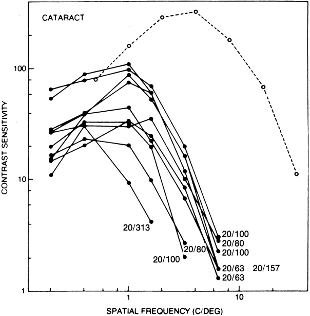 is usually taken as a benchmark for visual function. An inherent limitation of video technology is that the amount of information displayed on the screen is defined by the camera's field of view. Obviously, when characters are made larger, fewer can be simultaneously displayed on a screen. For both normally sighted readers and those with low vision, Legge and associates14,15 found that reading rates are generally maximized when four or more characters are simultaneously displayed. Display of a window of fewer than four characters slows reading, whereas presentation of more than four characters limits the available magnification for a given video screen size. There are exceptions to this rule, however, and certain patients may continue to exhibit increases in reading rate when a window of up to 20 characters is employed.16 The reading rate of normal subjects declines markedly for contrast below 10%, as letters appear to fade into the background (see Figure 2). Most readers with low vision exhibit a sensitivity to image contrast that resembles that of normal subjects reading faded text. In the majority of patients with low vision, the minimum image contrast required for best reading speed averages 3.9 times that required by normally sighted subjects.11 Contrast is such an important parameter in CCTV reading performance that most patients with low vision prefer to use all of the contrast available from a CCTV display. In fact, contrast sensitivity of individual patients has been found to be a better predictor of CCTV reading performance than Snellen acuity tested at distance.17 The ability to detect threshold variations in contrast, in both the normally sighted person and the patient with low vision, is generally a function of the spatial frequency content of the image. Stripes, called gratings, having sinusoidally varying brightness are usually used to test contrast sensitivity at defined frequencies. Spatial frequency is defined as the number of cycles of alternation of the bright and dim stripes per degree of visual angle. Normal subjects exhibit maximal sensitivity to contrast for spatial frequencies of 2 to 4 cycles per degree,18 although spatial frequencies of as much as 25 to 30 cycles per degree can be detected when contrast is very high. The upper limit of spatial frequency detection corresponds roughly to threshold visual acuity for high-contrast Snellen letters. The reduced acuity of patients with low vision is reflected in a lower limit of maximum spatial frequency detection, but in these patients, the frequency of peak contrast sensitivity is usually reduced as well.17 As noted previously, the absolute contrast sensitivity of patients with low vision is also reduced. This is seen in Figure 3, which plots contrast sensitivity (the reciprocal of contrast threshold) as it varies with spatial frequency. The shapes of contrast sensitivity functions of different patients may vary even though their Snellen acuities are the same. It is tempting to think that there may be a way to manipulate the characteristics of the image to compensate for deficiencies in the contrast sensitivity functions of individual patients in order to improve their reading performance. One simple way to do this is through magnification, which has the effect of reducing the spatial frequency content of the image by the amount of the magnification factor. Another method of image enhancement proposed by Lawton18 employs computerized spatial frequency compensation filters to enhance the midrange spatial frequencies of images to compensate for specific deficits in the contrast sensitivity functions of individual patients with low vision. Although this method reportedly improves reading speed and reduces the amount of magnification required for reading, these claims have not been subjected to clinical confirmation.