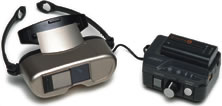 For distance viewing, a head-mounted camera system is available with an autofocus magnification range of up to 25×. The system has been updated to provide a more lightweight and compact design with a portable battery pack. The zoom feature and autofocus capability assists in discerning details with greater ease (Fig. 7) (Enhanced Vision Systems, Huntington Beach, CA). The head-mounted design enables hands-free use. The autofocus feature allows a wide range of viewing distances. Contrast enhancement and reversal permit individuals to select optimal images for different tasks. Automatic video gain control and maintenance of constant screen luminance are functions of particular benefit to patients with adaptation/glare difficulties. Finally, the system allows for binocular viewing and the possibility for a wider field of view. Disadvantages include weight, appearance, cost, complexity of operation, and potential problems of motion sickness and claustrophobia. When viewing through a magnifying system, retinal image motion is magnified, and the visual vestibulo-ocular reflex gain must be equal to the magnification to stabilize the retinal image. The systems are unsuitable for patients with serious hand/head tremors or patients who are physically unable to operate the controls or support the headset.29
