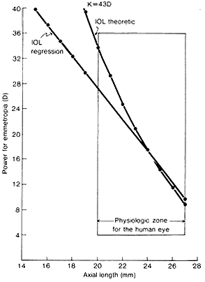This formula was used to determine the IOL power of lenses that were inserted into 150 eyes.20 In 136 eyes, the postoperative refraction was within 1 D of the value calculated preoperatively; in 12 eyes, the refraction was within 1.1 to 2 D, andin only two eyes was the difference greater than2 D. Thus, with the use of accurate methods (e.g., ultrasonography) to measure the axial length of the globe, estimates of the required IOL power can be made with some degree of accuracy.21,26–28 Hoffer has tabulated the accuracy of various formulas in predicting emmetropic IOL power.29,30 These so-called first-generation formulas assumed an ACD that was independent of the sizeof the eye. Various theoretically derived first-generation formulas for emmetropic IOL power have been examined graphically and algebraically.31–33 With the exception of Binkhorst's formula, which predicts a value 0.5 D higher than the others, all the theoretically derived formulas are reducible to the same equation.4,31–33