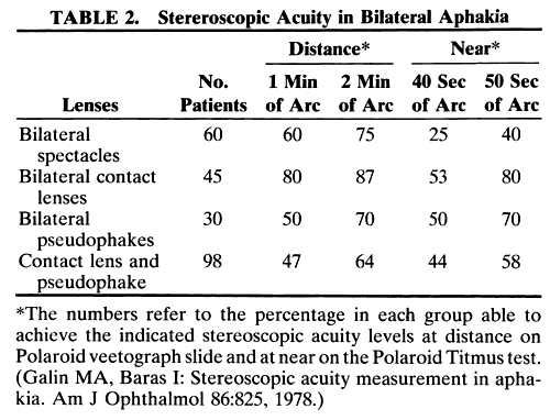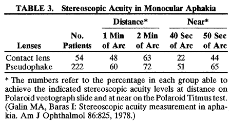 Eikonometric measurements confirmed that image sizes were larger in contact lens wearers, but rarely more than 5%. These eikonometric measurements were not clinically significant. The investigators concluded that contact lenses and IOLs result in visual performance and function superior to that of spectacles. In general, however, they concluded that patients with IOLs did not have stereoacuity superior to that of patients whose vision was corrected with contact lenses. Patients with a contact lens in one eye and an implant in the other may prefer the latter for reasons of convenience ratherthan optic or physiologic superiority of the IOL.267–269Contact lenses were an adequate optic alternative to IOLs. Aniseikonia and stereoacuity were found to be related when studying 90 unilaterally aphakic patients with Titmus's stereotest.252 Aniseikonia was measured with the New Aniseikonia Test (developed by Awaya in Tokyo). The 57 unilaterally pseudophakic patients had an average aniseikonia of 2.8%, and of these 68.4% had stereoacuity of 100 seconds of arc (Titmus's circle # 5) or better. The 27 contact lens wearers had an average aniseikonia of 4.6%, and of these only 40.7% achieved 100 seconds of stereopsis. The six patients whose vision was corrected with spectacles had average aniseikonia of 17.8%, and only one had stereoacuity of 400 seconds, the other five being unable to perceive even 800 seconds of arc. Interestingly enough, there was no direct linear correlation between the degree of aniseikonia and stereoacuity. This may be because of the visual system's ability to compensate for and overcome small amounts of aniseikonia. A balance in the level of visual acuity of the two eyes was also a factor in good stereoacuity. OPTIC RESULTS IN CHILDREN The problem is somewhat more complex in treating unilateral cataracts in children. A child who finds it difficult to fuse the images of both eyes can escape the problem with suppression and amblyopia.224,270 Early reports of results of contact lens correction of monocular aphakia in children were disappointing, with an extremely high incidence of amblyopia and heterotropia.224,243,270–272 Orthoptic and visual results following IOL implantation were said to be superior and led some authorities to conclude that contact lenses should not be used in treatment of childhood unilateral aphakia because they reduced the potential for binocular reeducation.224,270–274 Technological improvements in contact lens design have now allowed successful fitting in pediatric patients.264,275,276 Conversely, others have reported poor results with contact lenses in congenital cataracts, obtaining superior visual results with primary IOL implantation.277 Some have implanted IOLs in children in whom contact lenses had been tried unsuccessfully or in whom it was thought that contact lenses would have been likely to fail.278–280 Pediatric ophthalmologists were initially cautious in introducing the use of IOLs in children, particularly those younger than 2 years of age. As surgical techniques and IOL design have continued to improve, however, results have improved and ophthalmologists have become more aggressive in pursuing this therapy.281 In a 1994 survey, 46% of pediatric ophthalmologists said that they were implanting IOLs in pediatric patients. An editorial in 1996 suggested that IOLs have become the standard of care for pediatric patients older than 2 years of age.282 The importance of early correction of congenital cataracts has been increasingly emphasized in an attempt to prevent the development of irreversible deprivation amblyopia.283 Infants with congenital cataracts operated on later than at 8 weeks of age showed a statistically significant lag in psychological development (which may be reversible).276 Children with cataracts operated on after 10 to 12 weeks of age developed pendular nystagmus.276 In another study, eight patients with monocular cataracts were operated on at age 6 weeks or younger. Contact lens correction was instituted, and patients underwent monthly retinoscopy. Contact lenses were prescribed for a distance of 33 cm (i.e., making the child 3.00-D myopic), and the contact lens was changed whenever retinoscopy revealed a significant change in the eye's refractive status. (Contact lenses in this study were + 26 to + 30 D). In a full-term neonate, the crystalline lens has a mean power of 34.4 D, compared with a mean value of 18.8 D in an adult's eye.284 An 8-D decrease in corneal curvature was also noted from infancy to adulthood. This obviously raises the question of just what power IOL would be appropriate in a very young infant. An IOL calculated for a neonate's eye rapidly becomes too strong as the eye grows. If surgery for congenital cataracts is to become more commonly performed in the neonatal period, the usefulness of IOLs in such patients may be limited.285 However, contact lenses were also changed owing to fitting problems of the infant cornea. Although no permanent corneal damage occurred, problems were encountered with contact lens tolerance and reten-tion. Five of the eight patients had visual acuities of 20/30 or better after a mean follow-up of 2.8 years. Interestingly enough, even with the excellent visual acuity results, no patient demonstrated any binocular interaction. It is not clear whether this is because of the aniseikonia induced by the high plus contact lenses used (initially 26 to 30 D) or by other factors, such as the severe deprivation of binocular input during the early period of intensive patching of the phakic eye, which was performed as part of the protocol of this study. Although the poor results with some of the early contact lens studies may have been related to the increased image magnification and aniseikonia, at least two other factors must be evaluated. First, poorly fitting aphakic contacts may slide around on the cornea, and while they do so they induce a prismatic image displacement that may result i