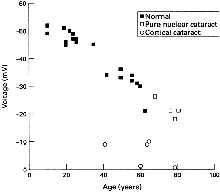 | The membrane potential of the human lens depolarizes with age (see Fig. 2) and the decline becomes most significant after the age of 50 years.54 Theion concentration and electrical data indicate thatPNa/PK progressively increases and as the measured electrical conductance and