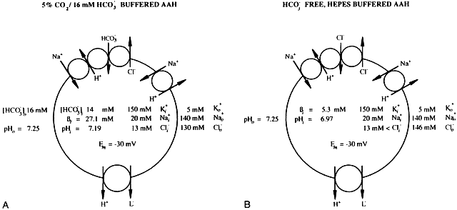 is a continuous production of H+ from lactic acid. The early studies on pH regulation were performed on amphibian75 and chick lenses76 and both showed that Na+ /H+ exchange was an important regulatory mechanism. However, the conclusions from the two studies differed on the role for HCO3-. In the chick, it appears that HCO3-/Cl- exchange is important, but in the amphibian system, HCO3- appears to exchange with Na+ rather than Cl-. More recent work performed on rat, bovine, and human lenses goes some way to reconcile these differences and has highlighted the importance of the com-plex Na+ -Cl--H+ -HCO3- quadruple exchanger. The most detailed studies have been performed on rat and bovine lenses,66,68,77 but the conclusions (Fig. 3) are directly applicable to the human lens77 (G. Duncan and M.R. Williams, unpublished data). The HCO3-/Cl- exchanger has been excluded since the inwardly directed gradient for chloride would ex-pel HCO3- from the lens and so tend to acidify fur-ther the internal contents. It is important to note that in the situation in which cells are bathed in a bicarbonate-free medium (see Fig. 3B), there is a lessening of pH regulatory powers for two reasons. First, the quadruple exchange is no longer transporting HCO3- into the lens but cycles Cl- instead. Second, the measured buffering capacity (β1) has been greatly reduced, presumably because of the loss of the HCO3-/CO2 buffer system. It is possible to separate the contributions from the different exchangers by manipulating the respective gradients and also by adding either the stilbene derivatives (SITS and DIDS), which inhibit the quadruple exchanger, or amiloride, which inhibits Na+ /H+ exchange.78,79 The very rapid acidification produced on inhibiting either of these systems has been observed in perifused bovine and human lens cells using the trapped-dye (BCECF) technique. Evidence for the lactate transporting system comes from driving the cotransporter in the reverse direction by adding lactate to the medium and in this case a pronounced acidification is observed, which is greatly augmented in the presence of amiloride.68
