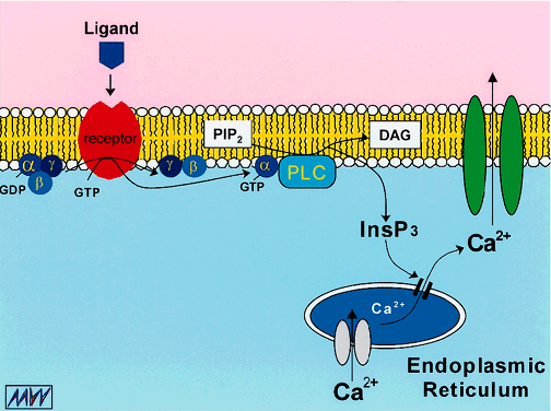 which calcium had increased.90 There also is evidence from studies performed on isolated fiber cells that calpain plays a role in the globulization process induced by calcium.91 It is interesting in this context that a localized increase in calcium can also give rise to localized changes in lens morphology.33 It is possible, therefore, that calcium has several roles to play in cataract. An increase in internal calcium can inhibit gap-junction communication and so helps seal off damaged cells.43 However, this would not explain why the spread of damage in the human lens also appears to be restricted in directions at right angles to the morphologic long axis of the fiber. It is possible that globulization or fusion of opposite facing fiber membranes may occur here, requiring a specific regional collapse of the cytoskeleton. In fact, it has been suggested previously that the lens cytoplasm acts as a stabilized gel until calcium enters to destroy this stability.88 Recently, it has become clear that calcium ions also have a more subtle role to play in lens physiology, and a number of calcium cell-signaling receptor systems have been identified in the human lens. These include the G-protein coupled muscarinic, purinergic, and histamine systems92–94 as well as the more familiar TK receptors stimulated by, for example, fibroblast growth factor (FGF), epidermal growth factor (EGF), and platelet-derived growth factor (PDGF).43 The presence of the muscarinic system is particularly interesting as it has been shown that exposure to drugs that interfere with acetylcholine metabolism increases the risk of cataract formulation in both humans95 and fish.96 Activation of either class of receptors by their respective agonists leads to a release of inositol (1,4,5) trisphosphate (IP3) into the cytoplasm. IP3, in turn, binds with its membrane receptor in the endoplasmic reticulum (ER) and promotes the release of massive amounts of calcium from the ER through the receptor channel into the cell cytoplasm (Fig. 4). Typical calcium cell-signaling oscillations can be observed in human tissue culture cells92 exposed to low concentrations of acetylcholine, and calcium oscillations can then give rise to voltage oscillations that can be observed through the entire lens.25