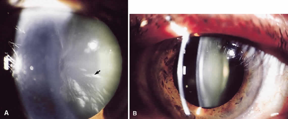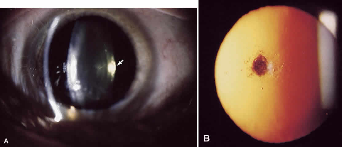 Nuclear cataracts (see Fig. 1) occur in the central region of the lens and appear to involve an acceleration of processes that occur during aging even in the normal lens. The proteins accumulate postsynthetic modifications, especially resulting from oxidation, leading to formation of protein aggregates that scatter light.5 The proteins in the nucleus also become progressively more pigmented with age; in some nuclear cataracts the color can become dark brown or even black. In such cases cataract may result from absorption of light rather than light scattering. In contrast to the cortical cataract, nuclear cataracts tend to become harder and less hydrated than normal, age-matched lens nuclei. Posterior subcapsular cataracts occur at the posterior pole immediately beneath the lens capsule (Fig. 2). These cataracts may result from improper posterior suture formation or from abnormal differentiation of lens fibers.6 In the latter instance lens epithelial cells may migrate to the posterior pole. Posterior subcapsular cataracts are formed after radiation with x-rays and long-term corticosteroid therapy and occur secondary to retinal degeneration diseases; they also occur idiopathically. |