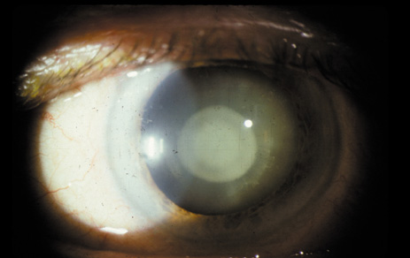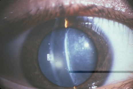 LENS EPITHELIAL DECOMPENSATION In some cases the entire anterior lens epithelium is observed to be edematous with resulting generalized haze (Fig. 20A). This is usually followed within a short period of time (a few months to 1 year) by the development of cortical cataracts and PSCs that mature quickly and cause severe, rapid loss of vision (Fig. 20B).