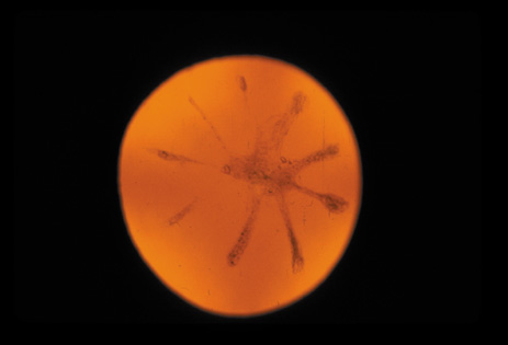 One can examine this type of cataract with direct illumination, using the narrow and broad beams of the slit-lamp to show the characteristic granular inner surface immediately in front of the posterior capsule (Fig. 13). The problem with this technique, however, is that patients may not tolerate any prolonged direct illumination because of the glare. Retroillumination is therefore more useful for revealing the outline of the opacity, since it is usually seen as an “island” in the center of the posterior capsule, which is further highlighted by the shadow cast by the opacities.33 However, in the early stages of this type of cataract, the dust-like particles that might be noticeable in the central posterior subcapsular area with direct illumination disappear or are difficult to see with retroillumination (Fig. 14). Eventually this “dusting” becomes dense enough to cast a shadow and thus appear on retroillumination. The smooth orange background of the fundus helps to highlight the rough, irregular pseudopodia-like edges of the central opacity. In advanced stages, the PSC may become a thick, calcified plaque (Fig. 15). During surgery, excessively vigorous scraping or vacuuming of the calcified opacity can lead to rupture of the posterior capsule. Usually, small remnants that are left behind after surgery are reabsorbed and do not interfere with vision; otherwise, they are easily treated with a neodymium : yttrium (Nd:YAG) aluminum garnet laser. Pathologic evidence suggests that most PSCs result from the migration of bow region cells into the potential space (along with accumulated cellular debris) between the posterior capsule and the cortex.34–36