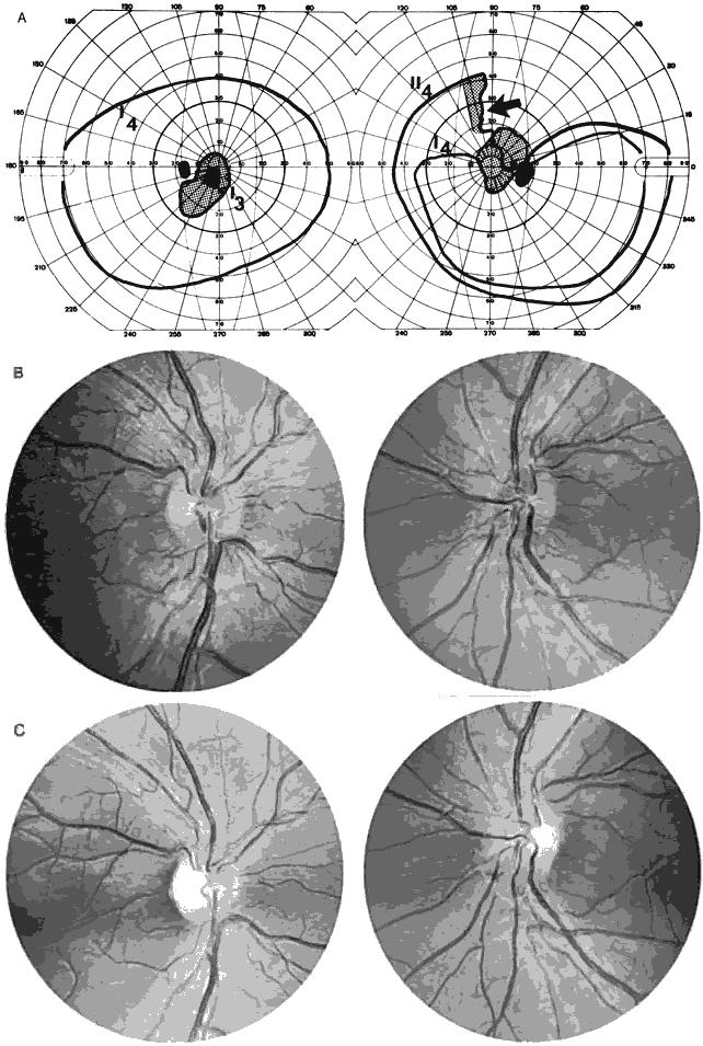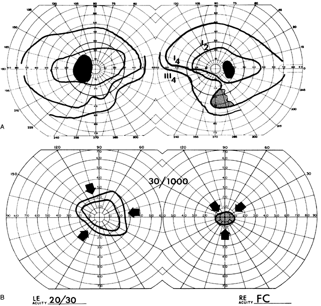 The retinal variety may be admixed in a person who suffers the more conventional attacks of migraine. It is presumed that vasospasm in the retinal circulation determines transient hypoxia, perhaps somewhat similar to the visual cortical event. On rare occasions, the fundus has been examined during typical retinal migraine episodes, and arterial constriction has been described. Wolter and Burchfield106 photographically documented such an episode and demonstrated mild “retinal edema”; vessel narrowing is also evident (Fig. 8). Fortunately, permanent complications of retinal migraine are rare. These may take the form of central retinal artery occlusion or ischemic papillopathy (see Volume 2, Chapter 16); nerve fiber bundle visual field defects may be demonstrated (Fig. 9). |