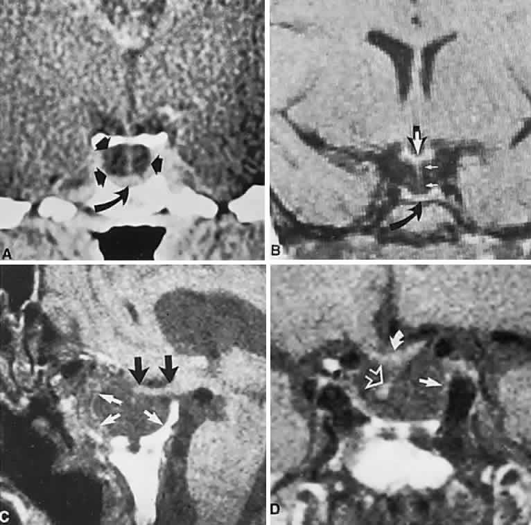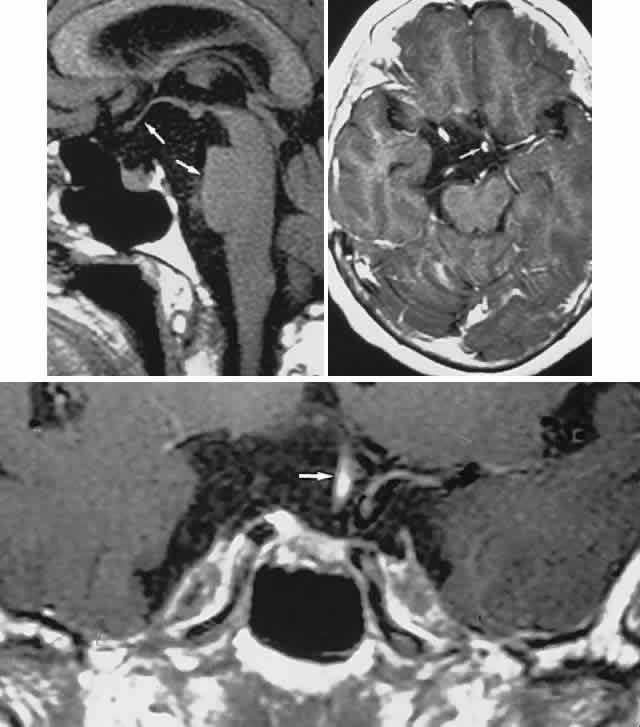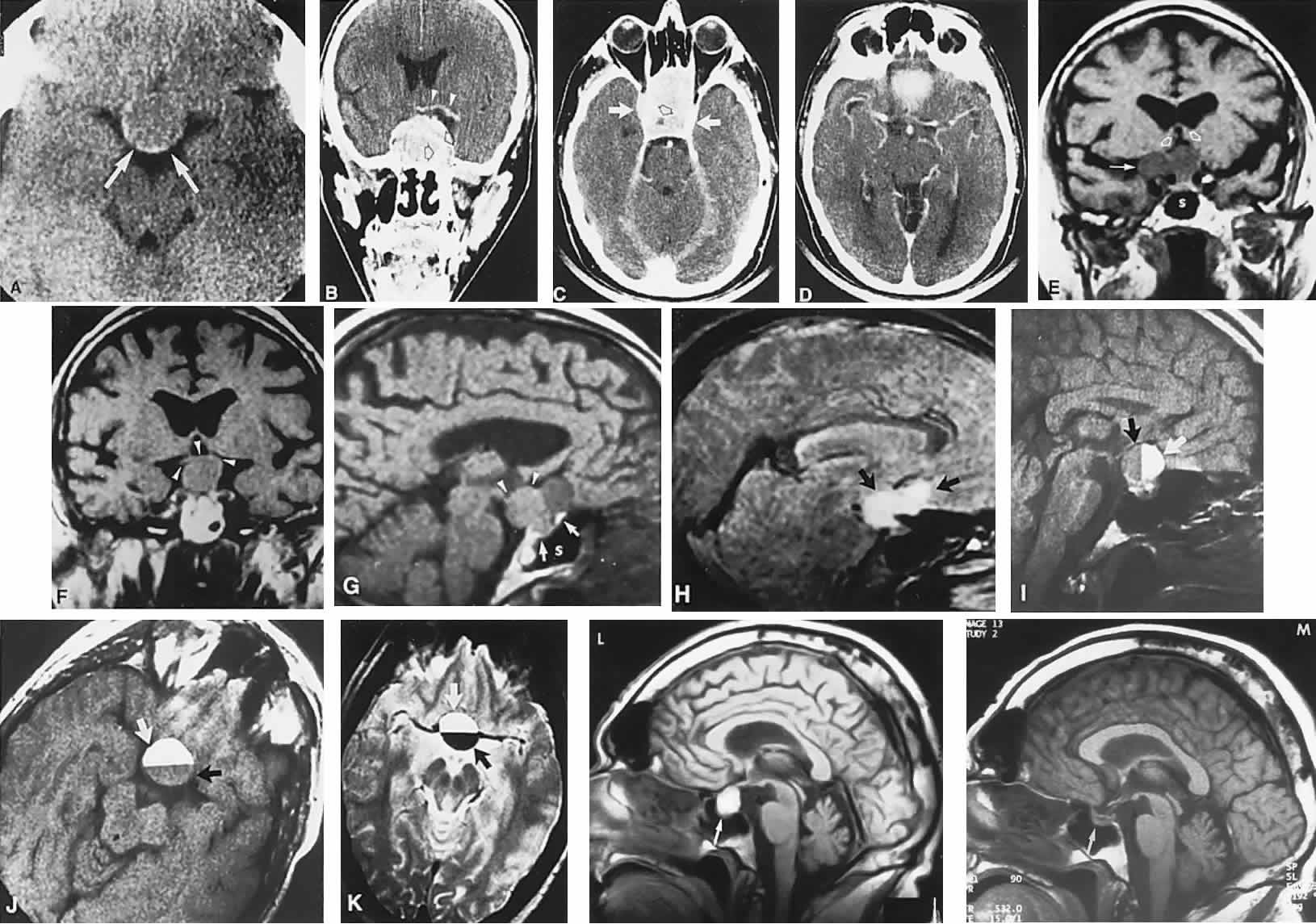 The clinical and radiographic characteristics of primary empty sella were thoroughly reviewed by Neelon and associates,220 the following features being notable: obese women predominate (27 women, 4 men), ranging in age from 27 to 72 years, with a mean age of 49 years; headache is a common symptom; in the Duke University study there was no instance of visual impairment due to chiasmal interference; an enlarged sella was found serendipitously on plain skull films obtained for evaluation of headaches, syncope, or other symptoms; pseudotumor cerebri was present in 4 women; 20 patients had normal pituitary function, and 8 demonstrated endocrine disturbances that included panhypopituitarism, or GH, gonadotropin, and thyrotropin deficiency. Hyperprolactinemia may occur in patients with intrasellar cisternal herniation without evidence of pituitary tumor, but the elevation of serum PRL is usually moderate. For example, in a study221 of 47 patients with empty sella, hyperprolactinemia was found in 6, with a range of 39 to 123 ng/L. Of course, adequate neuroimaging with enhanced CT or MRI (Fig. 20) will resolve the question of empty sella vs. mass lesion. Children are rarely included in this diagnostic category, but they are reported222 with primary empty sella and associated congenital anomalies, including delayed puberty, anosmia, diabetes insipidus, delayed growth, and optic atrophy.223 In a series of 19 patients with primary empty sella at the University of Michigan,224 the following features were noteworthy: all were women; 12 patients complained initially of headache; in 7 patients, visual disturbances were prominent subjective symptoms (blurred vision, diplopia, micropsia); 3 had bilateral papilledema and were believed to have pseudotumor cerebri; and 2 patients demonstrated minimal relative hemianopias without obvious cause. Although it is speculated that the high female preponderance noted in all series implies a mechanism related to physiologic hypertrophy and subsequent involution of the pituitary gland during pregnancy, there was no significant relationship between the number of pregnancies and sellar volume in the Duke University series. In the secondary form of empty sella that occurs following pituitary surgery or irradiation, adhesions may form between tumor “capsule” (or sellar diaphragm) and the optic nerves and chiasm. Retraction of these adhesions may draw the visual system downward into the empty sella, with resulting visual defects.225,226 Packing the sellar cavity prophylactically to elevate the diaphragma has been proposed,224 or “chiasmapexy” when chiasmal herniation is observed at surgical re-exploration.227 |