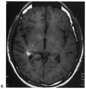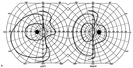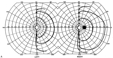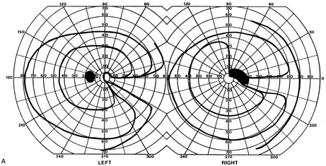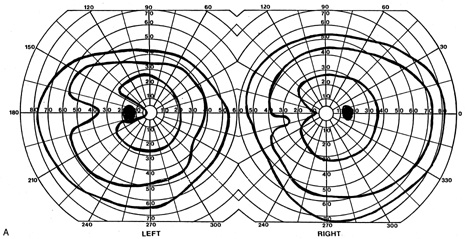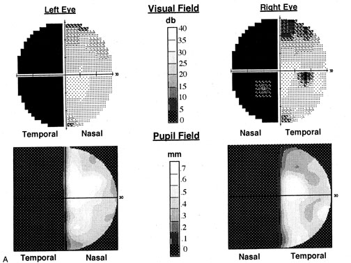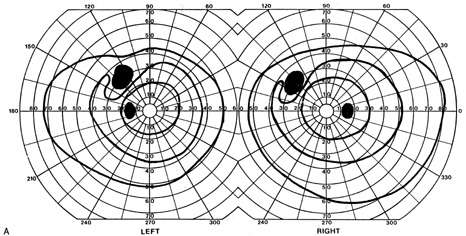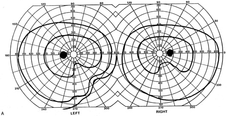 Posttraumatic transient cerebral blindness is a syndrome that affects children and young adults.73,104,105 It occurs in about 1% of closed head injuries.72,86,106 The impact is often in the parieto-occipital region.72,73,105,107Headache, confusion, anxiety, nausea, and vomiting are frequent,105 as is loss of consciousness at the time of injury in young children and adults.86 Blindness may occur immediately or after a few minutes,73,86,105,107 and in adolescents sometimes after a few hours.86 Vision recovers within 24 hours,105,107 although the course in adults is more variable, with occasional residual deficits.86 CT of the head often is normal,101,105,107 but EEG shows bilateral occipital slowing.73 Protracted recovery, especially in children, may indicate cerebral contusions107 or occipital lobe infarction from tentorial herniation.108 There can be a personal or family history of seizures and migraine.86 The course of cerebral blindness is variable. Blindness can last hours, days, or weeks; or evolve into a hemianopia or other field defect. The patient may recover fully, or the deficit may become permanent.71,76,102 If there is recovery, it usually occurs within 5 months.71 Recovery of useful vision is more likely in children than adults.102 The prognosis is better with hypotension during cardiac surgery than with other causes.71 The prognosis with hypoxia is worst for preterm infants, who tend to have periventricular leukomalacia rather than parasagittal watershed infarctions. Optic radiation damage on their CT or MRI is a poor sign.109 Normal MRI in most other settings is a good prognostic sign71,109 and significant recovery can occur if hypoxic damage is limited to the visual cortex.109 Spike-and-wave discharges on EEG are associated with multiple handicaps and poor visual recovery.71 Transient cerebral blindness occurs in about 1% to 15% of patients with pre-eclampsia or eclampsia.97,98,110 Fluctuations in blood pressure with peripartum blood loss may contribute.111 The pathogenesis is analogous to that of hypertensive encephalopathy, with development of petechial hemorrhages and focal edema from impaired cerebral vascular autoregulation, and ischemia from vasospasm.98,112 CT scans may be normal or show bi-occipital lucencies.98,113 MRI is more sensitive, showing T2 hyperintensities and T1 hypointensities similar to those in hypertensive encephalopathy.112,114 Management is that of eclampsia, with magnesium sulfate, fluid restriction, and blood pressure control. The prognosis is good, with virtually all women regaining vision within a few hours to a week, rarely as long as 3 weeks.98 The differential diagnosis of eclamptic visual loss includes cerebral venous thrombosis115 and systemic hypoperfusion resulting from pulmonary emboli.116 Antiphospholipid antibodies may be associated with infarction or venous thrombosis.117 Eclampsia also can affect the eye, causing retinopathy with retinal detachment, edema, and vascular thrombosis118 or, more rarely, anterior ischemic optic neuropathy.119 Pituitary apoplexy can present with severe headache and visual loss and is a medical emergency. Anton's Syndrome About 10% of patients with cerebral blindness are not aware of their deficit and insist that they can see.57,60 This syndrome may be considered a form of anosognosia (denial of acquired impairment) that has been attributed to right hemispheric dysfunction or disconnections between the thalamus and right parietal lobe.120 Denial of blindness can also occur in patients with ocular or optic nerve disease when there is concurrent dementia or a confusional state. In contrast, altered mental status is not a necessary accompaniment of denial of blindness with lesions of the visual cortex. Thus, Anton's syndrome might be more specifically defined as denial of blindness in the absence of dementia or delirium. However, even this presentation is not specific to lesions of visual cortex, as it can result from unusual combinations of bilateral optic neuropathy and bilateral frontal lobe disease.121 Abnormalities in the Remaining Visual Field Some patients with hemifield visual defects complain of difficulties with their remaining vision, such as visual fatigue or blurring, especially in tasks with high attentional demands such as reading, finding a face in a crowd, or driving a motor vehicle. There is evidence that unilateral lesions produce not only contralateral scotomata but also deficits in both the remaining ipsilateral and contralateral visual fields. There are spatial and temporal contrast sensitivity deficits in the supposedly normal ipsilateral hemifields of patients with homonymous hemianopia.122 There is reduced sensitivity and increased response times to signals in both hemifields and reduction in the “useful field of view.”123 Saccadic response times to visual targets in the ipsilateral hemifield are also reduced.124 The origins of these subtle bilateral effects of unilateral lesions are unclear. One hypothesis is that the inevitably associated white matter damage disrupts visual connections, including projections from V1 to other visual areas, callosal connections between the same or different visual areas in the two hemispheres, and feedback projections from a higher visual area to a lower one. A lesion in one area thus can affect the functioning of another, more distant area (diaschisis). Disrupted connections can impair the synthesis of information from other vision areas and both hemispheres, producing “long-range” disturbances in both hemifields, outside the limited contralateral scotoma. Damage to extrastriate regions may have similar bilateral long-range effects, as shown in monkeys with lesions of area V4, for example. Thus associated extrastriate damage may contribute to impaired processing efficiency in the ipsilateral field of patients with hemianopia.123 Standard kinetic and automated static perimetry are not designed to detect such deficits. These tests ignore respon