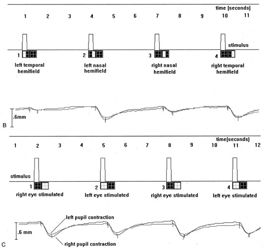 OPTIC TRACTS The optic tract is the continuation of the anterior visual system from the optic chiasm to the LGN. Only the contralateral hemifield is represented. The decussated nasal retinal fibers are not initially well aligned topographically with the other eye's temporal retinal fibers, but retinal correspondence improves towards the termination of the tract at the lateral geniculate nucleus (LGN). The retinotopic map is also tilted in the optic tracts, so that the macula is represented dorsally, inferior retina (superior visual field) laterally, and superior retina (inferior visual field) medially (see Chapter 4, Fig. 9).1 The magnocellular and parvocellular axons also may be segregated, with magnocellular axons more ventral.2 Both of these topographies are mirrored in the LGN. The main vascular supply of the optic tract is the anterior choroidal artery. The functional anatomy of the optic tract is reflected in several important clinical findings. First, partial lesions cause contralateral homonymous defects that can be markedly incongruous (different patterns of visual loss in the two eyes) because of the poor topographic alignment of the two retinal maps (Figs. 1 and 2).3,4 In contrast, lesions of the optic radiations cause only mild incongruity and striate lesions are highly congruous. Complete transection of the optic tract leads to congruous complete hemianopia, although this is less frequent than partial lesions. Reduced acuity with an optic tract lesion indicates bilateral tract damage or extension of the lesion to the optic chiasm or optic nerves.4,5 Second, because the axons in the optic tract originate from retinal ganglion cells, damage to the tract causes optic atrophy over time. This is present in both eyes, but because only half or less of the axons of each eye are affected, the atrophy is less severe than with most optic neuropathies. Also, the pattern of optic atrophy differs between the eyes. In the eye with temporal field loss, the axons from the nasal retina are affected. The fibers from the nasal periphery enter the nasal side of the disc, whereas those from the nasal macula enter the temporal disc in the papillomacular bundle. Atrophy is seen in these nasal and temporal wedges of the disc but the superior and inferior sectors are spared, because these contain fibers from the temporal retina. The result is “bow-tie” optic atrophy (see Fig. 1). In contrast, atrophy in the eye with nasal field loss affects the superior and inferior wedges and papillomacular bundle, but not the nasal wedge. This appears as diffuse or temporal disc pallor. Another distinctive optic disc picture occurs in the eye with temporal field loss when a mass lesion causes papilledema and compresses the optic tract. Disc swelling occurs in the superior and temporal disc but not in the atrophic bow-tie regions, creating “twin-peaks” papilledema (see Fig. 2).6,7 Third, because fibers for the pupillary reflex also travel in the optic tract, often there is a relative afferent pupillary defect (RAPD). With a significantly incongruous hemianopia, the RAPD may be in the eye with greater visual loss. With a complete tract lesion the RAPD is in the eye with temporal field loss,4,8 because the temporal hemifield is larger and there are slightly more axons from the nasal than temporal retina (ratio 53:47). The RAPD is a useful sign in optic tract hemianopia because it may be present at a time when optic atrophy has not yet developed (see Chapter 15).9 Other reported pupillary abnormalities include Wernicke's hemianopic pupil, which is an intraocular afferent pupil defect, with less pupillary constriction from light on the hemianopic hemiretina compared to light on the intact hemiretina. Wernicke's hemianopic pupil is difficult to elicit at the bedside because of intraocular light scatter,3 although it may be seen with computerized pupillometry (Fig. 3). The combination of optic atrophy, RAPD and field incongruity is important to recognize with homonymous hemifield defects, because it changes the differential diagnosis of hemianopia (Fig. 14). Most hemifield defects from lesions of striate cortex or the optic radiations result from vascular disease or other intracerebral pathology. Most optic tract lesions are compressive extrinsic masses, with a differential diagnosis similar to that for optic chiasmal lesions (see Chapter 6). In fact, patients with combined damage to the optic tracts, chiasm, and nerve are not rare.4,10–13 Pituitary adenomas, giant aneurysms of the internal carotid artery, meningiomas, and craniopharyngiomas are the chief causes of optic tract dysfunction. The investigation of choice is imaging of the parasellar region, with coronal and axial sections and contrast administration. Less common lesions include inflammatory conditions such as multiple sclerosis3,11,14,15 and sarcoidosis (see Fig. 1).16 Intrinsic optic pathway gliomas may occur in the optic tracts. Vascular lesions are rare, but there are reports of cavernous angiomata10,17 or arteriovenous malformations.18 Optic tract infarction can complicate anterior temporal lobectomy, possibly from vasospasm of the anterior choroidal artery.19 Trauma can affect the optic tract.3 Radiotherapy of pituitary tumors may be followed years later by optic tract necrosis.13 Optic tract dysfunction is a side effect of alpha-interferon.20 On occasion there is congenital absence of the optic tract 21; such patients are often unaware of their hemianopia. Associated abnormalities are unusual.3 These include endocrine disturbances from hypothalamic dysfunction and memory impairment from temporal lobe involvement,22 reflecting the proximity of the optic tracts to these structures (see Chapter 4). LATERAL GENICULATE NUCLEUS The LGN is a subnucleus in the ventro-postero-lateral corner of the thalamus. Neighboring thalamic subnuclei include the medial geniculate nucleus ventromedially, ventral posterior nucleus dorsomedially, and pulvinar superior