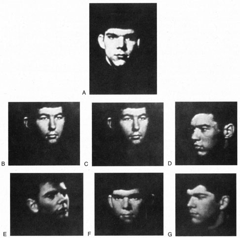 On the Boston Naming Test a subject is asked to name line drawings of objects (Fig. 22). The Visual Naming subtest of Multilingual Aphasia Exam requires the naming of photographs of objects. The Facial Recognition Test311 asks patients to select which of several pictures of faces, photographed at different angles and in different lighting conditions, match a target face (Fig. 23). Because these faces are unfamiliar, this tests face perception rather than face recognition. Face recognition can be tested by presenting pictures of presidents, movie stars, and famous athletes.
