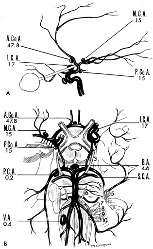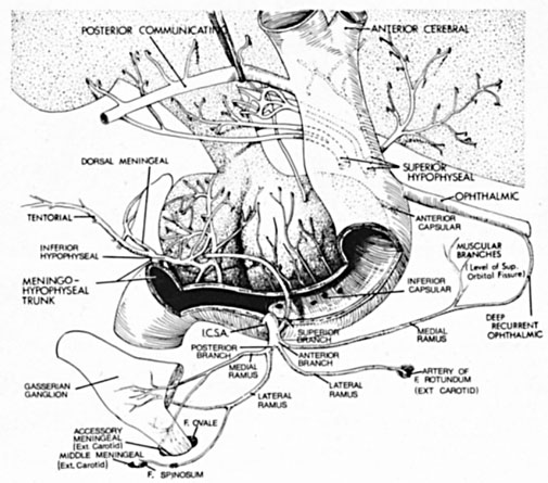 and in the application of diagnostic and therapeutic techniques. The S-shaped intracavernous segments of the internal carotid arteries lie within a bilateral plexus of freely communicating venous channels that comprise the paired, extradural parasellar cavernous sinuses. An extensive arterial anastomosis interconnects the two intracavernous carotid arteries, which are also in communication with the meningeal arterial system arising from the external carotid arteries (ascending pharyngeal and internal maxillary arteries), internal carotid arteries and vertebral arteries. The three major intracavernous branches of the internal carotid artery are the meningohypophyseal trunk, the inferior cavernous sinus artery, and the superior hypophyseal arteries (Fig. 12).