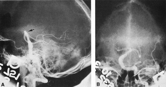Aneurysms, either saccular or fusiform, also cause neurologic deficits by progressive enlargement rather than by rupture. For example, visual loss caused by compression of the optic nerve from fusiform distortion of the supraclinoid carotid or ophthalmic artery, or saccular enlargement of the intracavernous carotid artery that produces chronic ocular motor palsies. Symptoms in patients with aneurysmal compression of the anterior visual pathway may include visual loss that can be acute, gradual, or fluctuating. SACCULAR ANEURYSMS Intracavernous Carotid Intracavernous carotid aneurysms constitute only 2% to 3% of all intracranial aneurysms and are unique because of their location. These aneurysms arise from the internal carotid artery as it traverses the cavernous sinus4 (Fig. 3) and therefore produce a specific constellation of ocular and neurologic signs and symptoms. Rupture of such aneurysms, which are almost always saccular, may possibly result in carotid–cavernous sinus fistula, but subarachnoid hemorrhage is rare.5 However, slowly progressive enlargement is the rule, usually occurring within the cavernous sinus, with compression of the third, fourth, and sixth cranial nerves and later involving the first and second divisions of the fifth nerve (see Chapter 12).6 Progressive enlargement of the aneurysm forms a mass in the floor of the middle cranial fossa, compromising motor as well as sensory functions of the trigeminal nerve. Anterior expansion of the aneurysm erodes the anterior clinoid, optic foramen, and superior orbital fissure, eventually producing unilateral visual loss and exophthalmos. Posterior expansion, which occurs later, can erode the petrous portion of the temporal bone, causing ipsilateral facial palsy and, rarely, deafness. The sphenoidal sinus and the nasopharynx may infrequently be involved by inferior expansion and medial extension erodes into the sella and may simulate a pituitary tumor7 or cause bilateral ophthalmoplegia.8 Bilateral saccular intracavernous aneurysms occur uncommonly.9 The onset of signs and symptoms is usually insidious, at times accompanied by pain about the eye and frontal area on the involved side. The pattern of serial involvement of the cranial nerves within the cavernous sinus is usually as follows: sixth, third, fifth, and fourth. Occasionally, palsies evolve simultaneously and the ipsilateral optic nerve may eventually be encroached on by superior expansion of the aneurysm. The pupil is often not dilated maximally, as in the usual acute third-nerve palsy; it may be relatively small (rarely immobile) because of simultaneous involvement of the oculosympathetic fibers.6 Barr and associates4 believed that such aneurysms usually arise as a weakness in the lateral wall of the carotid artery within the cavernous sinus and that the aneurysm tends to expand laterally between the third and fourth nerves superiorly and the sixth nerve inferiorly, finally compressing the nerves on the medial wall of the aneurysmal sac rather than laterally. Late involvement of the fifth nerve is emphasized by the findings that, in the three studied cases, this nerve was not splayed over the lateral aspect of the aneurysm, but that it lay mainly inferior, lateral, and posterior in the region where late expansion of the aneurysm occurs. Although periocular pain has often been emphasized as a prominent symptom, it may not occur until ophthalmoplegia has been present for years. Intracavernous aneurysms are suspected by the clinical presentation of a chronic cavernous sinus syndrome and are diagnosed by enhanced computed tomography (CT), magnetic resonance imaging (MRI), and arteriography (see Fig. 3). Because of the location and configuration within the cavernous sinus, direct surgical approaches to cavernous carotid aneurysms are hazardous. In recent years intravascular occlusion of the internal carotid by detachable balloon has evolved as a safe and successful procedure, often with relief of pain and improvement in ophthalmoplegia.10 Unfortunately, these balloons are commercially unavailable at the time of this writing. Carotid–Ophthalmic Artery The carotid–ophthalmic aneurysm arises from the superior or medial surface of the carotid artery above the cavernous sinus and below the origin of the posterior communicating artery. Such aneurysms have an intimate relation to the anterior clinoid and optic nerve, which tend to cover their point of origin. They are rare in reported series: Pool and Potts11 cited only two examples in 157 cases, and there was a 5.4% incidence in 2,672 patients with single aneurysms in the Cooperative Study of Intracranial Aneurysms and Subarachnoid Hemorrhage.12 Ferguson and Drake13 reported 32 such aneurysms; Guidetti and LaTorre14 reported 16 cases. A high incidence of concurrent cerebral aneurysms has been reported: 67% in one series14 and 37.5% in another.15 There is a striking correlation between aneurysmal projection and visual impairment. With superior-medial projection, optic nerve compression with monocular visual loss is often present. Eight of 16 patients reported by Guidetti and LaTorre14 had prominent visual symptoms with reduced vision and optic atrophy. Larger aneurysms may involve both optic nerve and chiasm. However, Ferguson and Drake13 reported 32 patients with preoperative visual deficits. While involvement of the anterior visual pathway is the most frequent neuro-ophthalmologic presentation, paralysis of the third cranial nerve was reported in a single case. Although deemed a rare event,13 visual loss occurs in approximately one-third of patients with carotid–ophthalmic aneurysms.15 Aneurysms in this location may traverse the adjacent optic nerve or chiasm by actually splitting it, the mechanism of which is still unknown. Presentation with visual disturbance is again variable.16 Carotid–Supraclinoid One of the more insidious and potentially treatable causes of progressive visual loss is unruptured aneurysm of the 