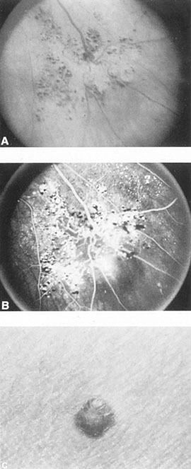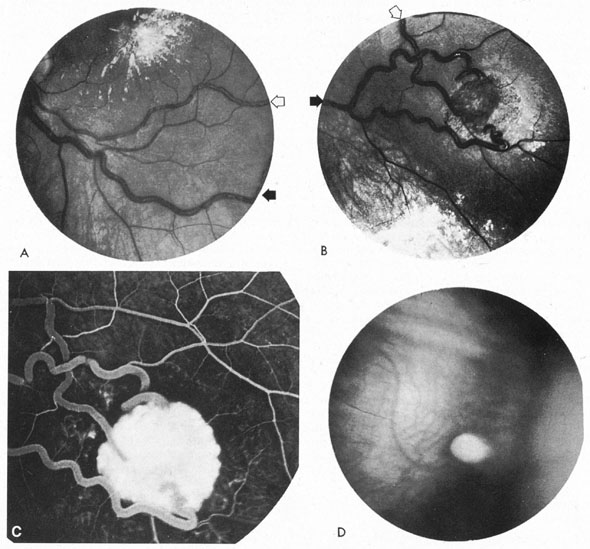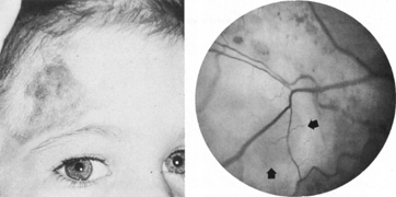 proton spectroscopy has allowed more thorough and accurate diagnosis.162,163 RETINOCEREBELLAR ANGIOMATOSIS (VON HIPPEL-LINDAU DISEASE) After von Hippel's description of angiomatosis retinae, Lindau synthesized the clinical entity, which includes angiomas of the retina, brain, spinal cord, and viscera. While the retinal lesion may be the clue that identifies the disease (and causes loss of vision), it is the cerebellar hemangioblastoma (cystic or solid) that potentially dooms the patient.163 The disorder is inherited, in the majority of instances, in an autosomal dominant pattern with variable and incomplete penetrance, the gene mapped on the short arm of Cr3. DNA extracted from blood may be analyzed for a 3-base pair deletion of the VHL gene, thereby identifying Von Hippel-Lindau (VHL) disease gene carriers.164 The penetrance of this disease is age- and tumor-dependent, with most patients presenting in the second and third decades. When angiomatous lesions become symptomatic, a careful family history is mandatory, and examination of first- and second-degree relatives is ideal. Symptoms are usually related to the retinal or cerebellar lesions, but spinal cord hemangioblastomas occur, and other visceral hamartomas should be sought; these include the following: pancreatic, lung, epididymal, and renal cysts; renal cell carcinoma; pheochromocytoma; and multiple visceral angiomas.163 Indeed, the lifetime risk for renal clear cell carcinoma amounts to 70% and is the most frequent cause of death. Pheochromocytomas affect 7% to 20% of reported patients and can be bilateral and malignant. The retinal lesions (von Hippel tumor) may take the form of a fully developed elevated angioma in the midperiphery (Fig. 23), an incipient small nodule, or of minuscule anomalies on the disk.165 Hemangioblatoma of the optic nerve is reported, associated with cerebellar and visceral cysts.166 Most central nervous system lesions are found in the cerebellum, spinal cord, and brainstem; there is special predilection for the craniocervical junction and conus medullaris. Supratentorial lesions are rare, but chiasmal hemagioblastomas are documented.167 The larger retinal lesions are characterized by single enlarged and tortuous retinal arterial afferents and similarly dilated venous efferents. Yellowish retinal and subretinal exudate is seen, somewhat mimicking the exudative retinopathy of Coats retinal telangiectasia. Macular exudate or retinal detachment accounts for visual symptoms and may progress to proliferative retinopathy and secondary glaucoma. Multiple angiomas may occur in the same or contralateral eye. Indirect ophthalmoscopy and fluorescein angiography are exceedingly helpful in discovering small or incipient lesions. It is impossible to predict which patients with retinal angiomas harbor coexisting cerebellar lesions or other systemic harmartomas. In extensive and excellent reviews,163,170 the average age at onset of symptoms, whether ocular or neurologic, occurs in the 20- to 30-year age group, but definitely younger than 50 years of age. The cerebellar lesions present as chronic posterior fossa masses, with signs and symptoms of chronic headaches, vertigo, vomiting, and ataxia. In addition, 10% to 20% of cerebellar hemangioblastomas are associated with polycythemia. If polycythemia does not diminish following resection of the cerebellar lesion, it is likely that the mural nodule (Lindau tumor) was overlooked or that the patient harbors a renal cell carcinoma or pheochromocytoma.168 Neurodiagnostic studies in the presence of a cerebellar mass may be expected to show dilation of the ventricular system and signs of posterior fossa mass. These lesions, especially when small, are amenable to surgery, and therefore the prognosis is good. Rapid and durable recovery of visual function may follow systemic therapy with vascular endothelial growth factor receptor inhibitor su5416.169 Once the retinal angioma is diagnosed, all efforts should be directed to uncover the possibility of a cerebellar lesion and occult renal cell carcinoma. The Cambridge screening protocol,163,170outlined by Maher, recommends the following: annual physical examination and urinalysis; annual indirect ophthalmoscopy, with fluorescein angiography; MRI of the brain every 3 years to age 50 years, and every 5 years thereafter; annual renal ultrasound, with CT every 3 years; annual 24-hour urine collection for vanillylmandelic acids. ENCEPHALOTRIGEMINAL ANGIOMATOSIS (STURGE-WEBER SYNDROME) Among the most striking of the neurocutaneous vascular syndromes is that which includes facial hemangiomas, for which reason perhaps a more useful name would be meningooculofacial angiomatosis. In its complete form, the disorder is characterized by the following: (i) port wine angioma (nevus flammeus) of the face, commonly involving the distribution of the ophthalmic division of cranial nerve V (Fig. 24), but not limited to it; (ii) seizure disorder beginning in early life; (iii) gyriform cortical calcifications associated with leptomeningeal angiomatosis; (iv) homolateral buphthalmos or glaucoma, especially when the nevus extends to the lid; and (v) intellectual retardation in about 30%. In addition, hemiplegia or hemianopia may be seen contralateral to the cerebral lesion. Familial occurrence is unsubstantiated. Angiomatosis may occasionally involve the choroid plexus, thyroid, pituitary, lungs, gastrointestinal tract, pancreas, ovaries, and thymus. The Sturge-Weber syndrome is relatively rare, with a frequency of 1 per 50,000, and likely occurs as a result of embryologic malformation of vasculature affecting skin, eye, and brain. In a series of 51 patients seen at the Hospital for Sick Children, Toronto,171 71% had glaucoma, 69% had conjunctival or episcleral hemangiomas, and 55% had choroidal hemangiomas, almost half of which were bilateral. Choroidal hemangiomas may diffusely involve the entire uvea, or the hemangioma may be more localized (Fig. 25). For 