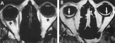 in 20% to 30% of patients.2 In addition to the common saccular (“berry”) aneurysm, the other morphologic type is fusiform, which most frequently but not exclusively involves the posterior vertebrobasilar system. Fusiform aneurysms are characterized by tortuous dilatation and elongation (dolichoectasia) of an artery and are usually associated with atherosclerosis, hence the synonymous term atherosclerotic aneurysm. The intracranial arteries have thin media and poorly developed or absent internal elastic lamina; they are particularly prone to develop small outpouchings at arterial branch junctions where developmental defects in the media exist. Histologic study of the saccular aneurysm often demonstrates a defect in the elastic and muscular coat, beginning at the point of origin (neck) from the parent artery. This finding has supported the concept of a developmental origin and created the term congenital aneurysm to designate saccular aneurysms, although these lesions are not present at birth. Factors such as hypertension, degenerative changes in the arterial wall, and heritable connective-tissue disorders as in the Ehlers-Danlos syndrome and neurofibromatosis-1, all play roles in the subsequent development of aneurysms. There is firm evidence of aneurysm disease in first- or second-degree relatives, and there is a distinct association with polycystic kidney disease and aortic coarctation.2 As noted, multiple saccular aneurysms of the carotid or vertebrobasilar system occur 20% to 30% of the time, frequently with identical or mirror sites found in the left-sided and right-sided circulations. Most aneurysms arise from the carotid system on the anterior communicating, middle cerebral, and internal carotid arteries, or they arise in the region of the origins of the posterior communicating arteries (Fig. 1A). Only some 5% of saccular aneurysms arise on the vertebrobasilar system (Fig. 1B). Usually, clinical symptoms are the result of rupture of an aneurysm, resulting in extravasation of blood under arterial pressure into the subarachnoid or intraventricular spaces or into the brain parenchyma, with intracerebral hematoma formation. Subarachnoid and intraventricular blood causes depression of consciousness; intracerebral hematoma and vascular spasm produce focal neurologic signs and even cerebral herniation with compression of the third nerve. The subsequent sudden increase in the intracranial pressure may result in sixth-nerve palsies, in subretinal, intraretinal, or preretinal hemorrhage, and in conjunctival and, rarely, orbital hemorrhage. Approximately 100 years ago, Terson recorded the occurrence of vitreous hemorrhage after spontaneous subarachnoid bleeding. Such ocular hemorrhage is believed to result from transmission of intracranial pressure through the subarachnoid communication between the optic nerve sheath and the intracranial cavity, with subsequent nerve sheath dilation and rupture of dural and bridging vessels (Fig. 2). Intraocular hemorrhage is possibly the result of retinal venous hypertension brought on by obstruction of both the central retinal vein and the retinochoroidal anastomoses. Kuhn et al3 have reviewed Terson's syndrome, including the role of pars plana vitrectomy; these authors noted the high incidence of preceding coma, and the efficacy of surgical intervention in visual recovery.