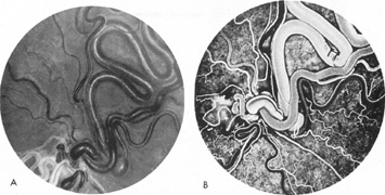 CAVERNOUS ANGIOMAS OF RETINA AND BRAIN Certain disorders link congenital vascular anomalies of the eye and brain, including familial cavernous angiomas of the retina and central nervous system, more commonly in the supratentorial space than posterior fossa. As a rule this syndrome is transmitted as an autosomal dominant trait and is characterized by seizures, headache, and intracranial hemorrhages.183,184 Gass185 believes that the retinal lesion is a vascular hamartoma (i.e., a cavernous hemangioma), but not an angiomatosis retinae, retinal telangiectasia, or racemose angioma. The lesion appears as a “cluster of saccular aneurysms filled with venous blood” at the nerve head or midretina (Fig. 29). Such cases are variably associated with small cutaneous angiomas, and bilateral retinal involvement has been documented as well as familial occurrence.186 Neither retinal nor cerebral lesion need be symptomatic. Rigamonti and associates184 have demonstrated the superiority of MRI over CT in discovering the cerebral angiomas, characterized by small-caliber feeding vessels with slow circulation and thrombosis. In general, it should be recognized that there is a wide and confounding spectrum of both hereditary and nonfamilial neurocutaneous angiomatoses, including various AVMs or hemangiomas of the skin and ocular fundus, associated with AVMs and venous anomalies of the brain. Leblanc et al187 suggested a useful classification of vascular neurocutaneous syndromes (Table 2). Fortunately, MRI and magnetic resonance venous angiography have evolved as practical and precise techniques in elucidating occult cerebral lesions and at least serve as preliminary studies that direct decisions for more elaborate selective arteriography. TABLE 2. Vascular Neurocutaneous Syndromes
