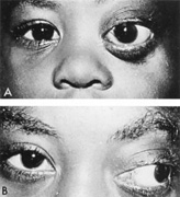 Cutaneovisceral hemangiomatosis (blue rubber bleb nevus syndrome; Bean's syndrome) is a rare congenital disorder with hallmark skin lesions (blue blebs) and gastrointestinal bleeding. The discrete venous malformations of varying size and appearance present as characteristic cutaneous lesions consisting of deep blue, soft, rubbery blebs, which are easily compressible. These malformations were described historically as cavernous hemangiomas, and inappropriately called hemangiomas. Ocular involvement includes lid blebs, iris and retinal angiomas,195 and orbital hemangiomas that may present with lid ecchymosis or intermittent proptosis,196 or intermitternt visual loss.197 VASCULAR DEFECTS RELATED TO TRAUMA The involvement of orbital veins with arteriovenous fistulas at the level of the cavernous sinus has been discussed previously. On rare occasions, shunts of the ophthalmic artery follow blunt or penetrating injury to the orbit itself. Orbital and ocular signs following such lesions are similar to those of carotid–cavernous fistulas. Internal carotid angiography shows enlargement of the ophthalmic artery and immediate opacification of either the superior or the inferior ophthalmic vein (Fig. 33). Posttraumatic arteriovenous shunts involving the intraorbital portion of the ophthalmic artery26 or its branches have traditionally been confused with primary arterial aneurysms of the orbit. The latter lesion is exceedingly rare. However, the case presented by Rubinstein and colleagues25 fulfills the angiographic criteria for acceptance. |