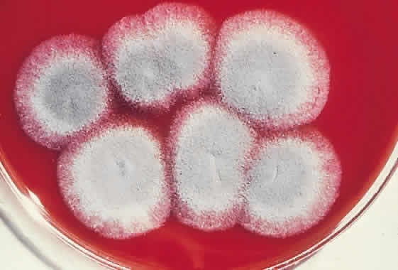 systemic). Yeasts or yeastlike fungi (e.g., C. albicans) are single-cell organisms, typically round or oval, that form discrete, smooth, creamy and moist colonies (Fig. 1) within 24 to 72 hours on routine microbiologic media. They reproduce or multiply by budding. The characteristic appearance is shown in Figures 2 and 3. Molds (e.g., Aspergillus fumigatus) are multicellular fungi that contain tubular structures (hyphae) and grow by branching and longitudinal extension. These are identified by their macroscopic (Fig. 4) appearance (e.g., cottony, woolly, powdery) or microscopic structures (conidia, hyphal segmentation), and color (Fig. 5). Some fungi may grow with both yeastlike and hyphal morphology in tissues or culture.