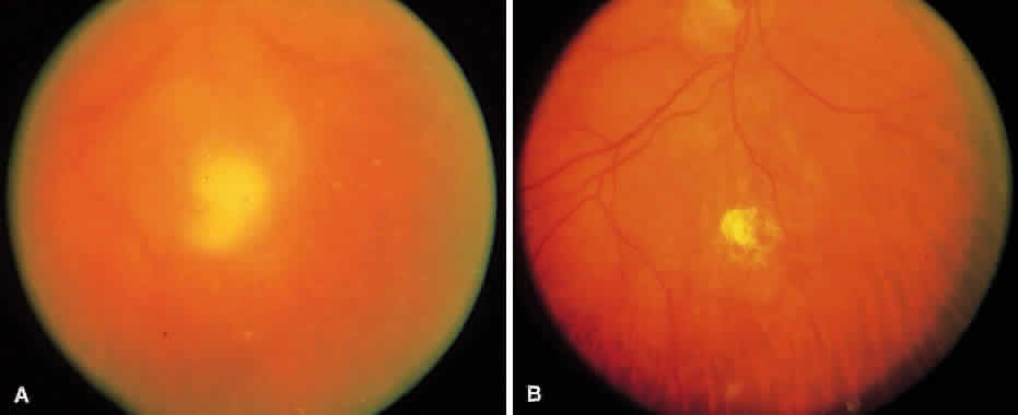 Illinois, Indiana, and Ohio.2,234,303 When the spores are disturbed, they become airborne. Human infection results from inhalation of these infectious particles. When they reach the alveoli, they convert to small yeast, which represents the tissue-invasive form. Once the organism gains access to the pulmonary alveoli, it travels to organs rich in cells of the reticuloendothelial system before immunity to the organism develops. After development of adequate cell-mediated immunity, macrophages kill the fungi in most immunocompetent persons. Greater than 90% of infected persons are asymptomatic, and the only evidence of previous infection is conversion of the histoplasmin skin test to positive. A few patients who inhale the infecting particles become acutely ill. In immunocompetent persons, this is usually an influenza-like illness with fever, chills, and nonproductive cough. It may be associated with erythema multiforme or erythema nodosum. If the infective dose is extremely high, patients may experience a fulminant pneumonitis with secondary respiratory compromise. Most immunocompetent patients with pulmonary histoplasmosis recover completely, but they are often left with pulmonary scars. The characteristic scar is a round fibrotic lesion with associated calcification (coin lesions). These pulmonary scars can often be found in patients living in areas endemic for histoplasmosis.303 A progressive, disseminated form of histoplasmosis can develop in patients with deficient cell-mediated immunity. This usually leads to a rapidly progressive wasting systemic illness. HIV-infected persons living in endemic areas are at greatest risk for this form of histoplasmosis.2,234,304,305 OCULAR MANIFESTATIONS Three main forms of ocular involvement by H. capsulatum have been identified in humans306–315: disseminated histoplasmosis with uveal, retinal, or optic nerve involvement; solitary histoplasmic chorioretinal granuloma; and the presumed ocular histoplasmosis syndrome. The latter syndrome is presumably due to histoplasmosis, although no organisms have been convincingly identified in the eye in most of these patients.314 The classic features of the presumed ocular histoplasmosis syndrome include peripapillary scars in combination with macular and peripheral pigmented or atrophic punctate scars. The major significance of these lesions is the later development of choroidal neovascularization resulting from macular scars. The findings are often picked up on routine fundus examination, and these patients are usually asymptomatic until they develop choroidal neovascularization.314 Occasionally these patients also develop what appears to be an active focal choroiditis that in some cases can be difficult to distinguish from a choroidal neovascular membrane clinically or on fluorescein angiography. The histoplasmin skin test is often positive in these patients. The scars in these patients are presumed to be due to an acute choroidal infection with the organism, but this is rarely identified.314,315 One report of an acute histoplasmosis choroiditis in two immunocompetent brothers enabled a rare opportunity to observe the acute form of what is believed to result in the typical presumed ocular histoplasmosis syndrome lesions.315 Endogenous histoplasmic endophthalmitis has been reported in several patients with disseminated systemic histoplasmosis.306–309 Most of the previously reported cases were in patients with AIDS.306,307 The ocular infection may result in a granulomatous anterior uveitis. Vitritis may be mild to severe. The classic fundus lesion is a cream-colored or gray-white chorioretinal infiltrate, often surrounded by hemorrhage. There may be associated retinal pigment epithelial alteration, indicating partial spontaneous healing. The lesions may be solitary or multiple and can range from less than a disc diameter to several disc diameters. Histoplasmic optic neuritis has also been reported in association with the chorioretinitis. The ocular findings are not specific for histoplasmic endophthalmitis, and the diagnosis should be suspected in any immunosuppressed patient living in an area endemic for histoplasmosis. Most patients have clinical and laboratory evidence of disseminated infection, in which case the ocular infection can be presumed to be due to histoplasmosis based on the known systemic infection. When the ocular infection is uncertain and there is significant vitreous involvement, a diagnostic vitrectomy should be considered. When there is no significant vitritis in a patient with choroidal infiltrates of unknown cause, chorioretinal biopsy can be considered, although this can be associated with significant risk. This is probably not indicated when the diagnosis is suspected based on known systemic histoplasmosis. Because culturing the organism can be difficult, the diagnosis of histoplasmosis is often made by pseudodiagnosis. A complement fixation test becomes positive 3 weeks after the onset of infection, and by 6 weeks a diagnostic titer may be obtained in up to 75% of patients. A Histoplasma polysaccharide antigen test is useful in the diagnosis of histoplasmosis in HIV-infected patients where the complement of organisms is high. The test is not sensitive for patients with low organism counts. The histoplasmin skin test is useful for determining whether immunocompetent patients have been exposed to the organism.316 TREATMENT As with other intraocular fungal infections, the systemic antifungal therapy is determined by the presence and extent of systemic involvement. Most acutely infected immunocompetent patients with histoplasmosis require no treatment. In the unusual situation where there is severe pulmonary infection, intravenous amphotericin B is initiated at a dose of 500 mg in 50-mg daily doses. Once the patient is stable, this can be switched to itraconazole 200 mg twice daily.317 Chronic pulmonary histoplasmosis in immunocompetent patients can be treated with either ketoconazole