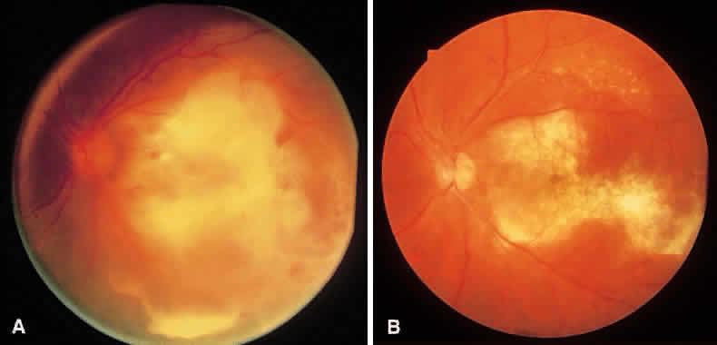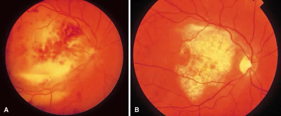 endospores can then give rise to future generations of the organism.234 The saprophytic mold fungus grows well on most routine culture media at room temperature. Definitive identification requires documenting the production of spherules at 40°C in liquid culture or in experimentally infected animals.234 The infection results from inhalation of arthroconidia. The arthroconidia are easily detached from the hyphae and released into the atmosphere. The organism is commonly found in dust. For this reason, agricultural and construction workers are particularly prone to infection. C. immitis is one of the most virulent of all fungi, and inhalation of only a few conidia in an immunocompetent host will produce infection. After exposure of the organism to the respiratory tract, the infection may result in a subclinical pneumonitis or mild to severe respiratory disease. In the immunocompetent person, it is usually self-limited and resolves in 2 to 3 weeks without significant sequelae. In unusual cases it can lead to chronic pulmonary disease and pulmonary scarring. Disseminated infection may occur in immunosuppressed patients, including AIDS patients and patients receiving steroids. The disseminated infection may result in a chronic cutaneous disease, a widespread lymphatic disease, bone involvement, visceral organ involvement, or meningitis.235–237 Coccidioidomycosis is highly endemic in the southwestern United States, northern Mexico, Central America, and several South American countries. The San Joaquin Valley is the most endemic area in the world. Since 1990, there has been a dramatic increase in cases of coccidioidomycosis documented in California. This recent increase in reported cases was related to cycles of severe aridity followed by intense rainfall. In addition, increases in construction with associated soil turnover in the area may have played a factor.238,239 DIAGNOSIS Culture of the organism from body tissues or direct identification histopathologically is the only way to make a definitive diagnosis. In addition, a skin test using extract from the saprophytic phase of the fungus may be helpful. Serologic tests, including the tube precipitin test, latex agglutination test, immunodiffusion test, and complement fixation test, may be used.234,237,240–242 OCULAR MANIFESTATIONS The first histologically proven case of endophthalmitis secondary to C. immitis was reported in 1948.243 Since then, several culture-positive and histopathologically proven cases have been reported.244–260 A prospective study found that 50% of patients with chronic pulmonary or disseminated coccidioidomycosis had ocular involvement.254 Because of this high incidence of ocular involvement, any patient with chronic pulmonary or systemic coccidioidomycosis should have a screening ocular examination. The ocular involvement can range from lid lesions to panophthalmitis. The anterior segment involvement may be extraocular and include conjunctivitis, episcleritis, scleritis, or keratoconjunctivitis. Intraocular involvement may range from a chronic granulomatous iridocyclitis to a fulminant acute anterior segment inflammatory response. Posterior segment involvement includes vitritis, choroiditis, and retinitis. There is a predilection for the peripapillary choroid to be involved, and patients may have peripheral punched-out scars similar to those seen in ocular histoplasmosis. Active choroidal lesions are often white and elevated and may involve the overlying retina. Subretinal fluid and exudate may be present. Scars may be seen in asymptomatic patients with a prior history of systemic coccidioidomycosis. In one study, 5 of 54 patients with documented systemic coccidioidomycosis had inactive peripheral chorioretinal scars.257 TREATMENT There is limited information regarding the treatment of ocular C. immitis infection.258–260 The organism usually responds to amphotericin B, although failures have occurred, both in the treatment of systemic infection and ocular infection.234,237,258–260 Intravenous miconazole has been used in cases of systemic coccidioidomycosis with ocular involvement, but the recurrence rate is high, and in one case the chorioretinitis developed while the patient was receiving the drug; in this case the infection subsequently responded to intravenous amphotericin B.255 Ketoconazole has been used in the treatment of systemic infection, but recurrence rates as high as 25% have been reported.261,262 In one study of 112 patients with nonmeningeal coccidioidomycosis, a success rate of 23% was obtained using 400 mg ketoconazole daily and 32% using 800 mg daily.262 Fluconazole and itraconazole appear to be effective for systemic coccidioidomycosis; however, their efficacy for ocular involvement is unproven.263,264 It is important to maintain a high index of suspicion for C. immitis infection in any patient with ocular inflammation of unknown etiology living in or traveling to an endemic area. This is particularly true for patients who have previous exposure to the organism. Ocular involvement has been reported as late as 22 years after primary systemic infection.258 |