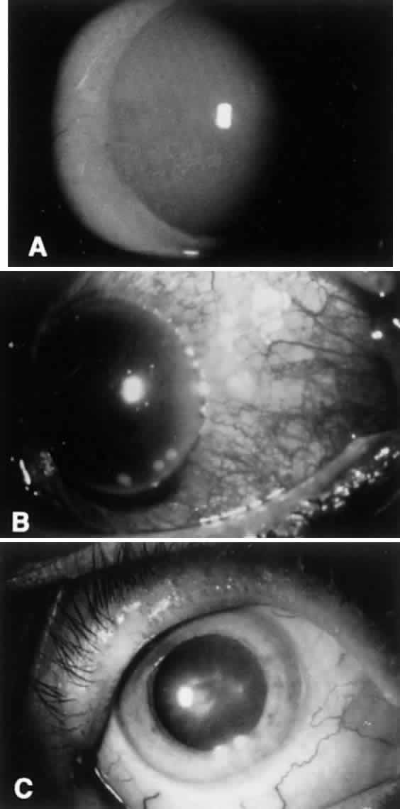 Fig. 3. The corneal manifestations of chronic staphylococcal blepharoconjunctivitis. A. Fine, inferior punctate epithelial keratitis. B. Marginal staphylococcal hypersensitivity ulcers located near the inferior limbus. C. Corneal phlyctenules resulting from chronic staphylococcal infection.