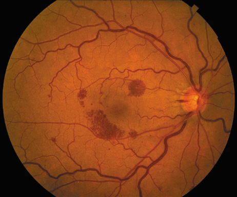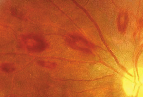 patients to this condition.35 The two main complications of NBTE are valve damage and embolic events. Valve damage often causes cardiorespiratory difficulties resulting from hemodynamic alterations. Emboli can cause infarctions of many organ systems, including the kidney, central nervous system, and gastrointestinal tract. The size of the vegetations varies from microscopic to about 4 mm. Autopsy studies have shown systemic embolization in approximately 40% of patients with NBTE.34,36 The ocular findings of NBTE include intraretinal hemorrhages, and branch (Fig. 4) and central retinal artery occlusion.37 Patients also may present with visual disturbances resulting from stroke, including gaze and visual field abnormalities.38,39 |