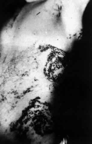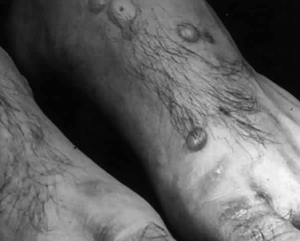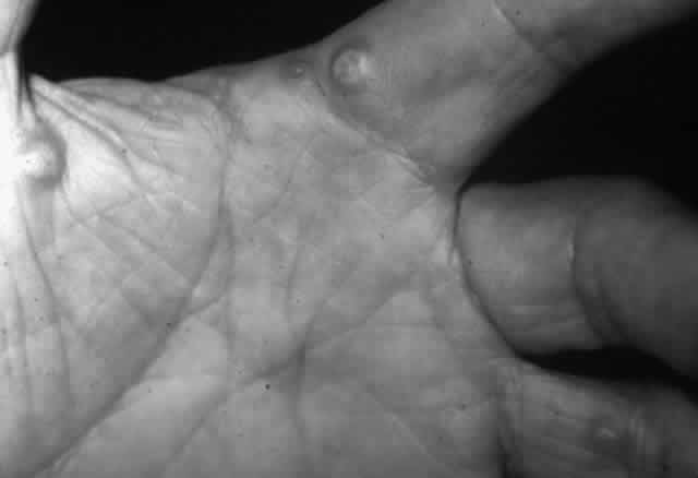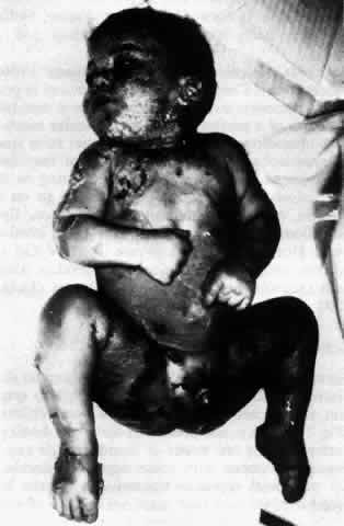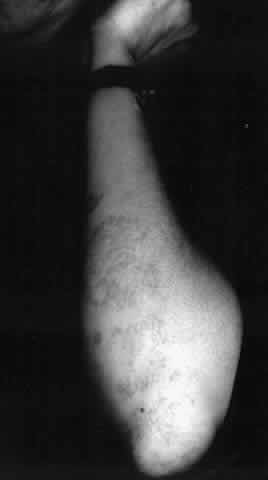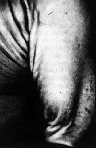 Symptoms in the hereditary form of EB tend to appear shortly after birth or in early childhood, and they reappear periodically during the patient's life. Epidermolysis bullosa simplex is the mildest form, and only 2% of these patients have any mucosal involvement. The mucosae are not involved in the hands-feet form. The recessive forms, epidermolysis bullosa letalis and dysplastic epidermolysis bullosa dystrophica, have mucosal involvement uniformly; conjunctival disease, although less common than oral disease, may be severe.105 Epidermolysis bullosa dystrophica is characterized by scarring of the skin over limbs, hands, and feet. The scars become keloidal, resulting in deformities of the limbs, hands, and feet; these are most severe in the dysplastic form (Fig. 17). The most severe involvement of mucous membranes also occurs in the dysplastic, recessive form of epidermolysis bullosa dystrophica.106
