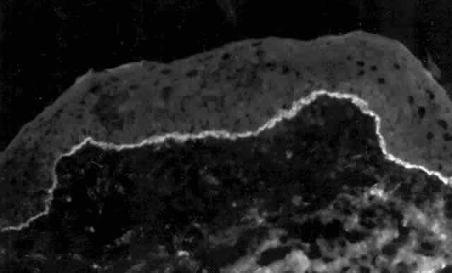 The characteristic histologic feature of pemphigus is acantholysis or loss of interepidermal cell bridges. This leads to bulla formation within the epidermis. The epidermis may be readily dislodged by lateral sliding finger pressure, the Nikolsky sign, a clinical feature shared with toxic epidermal necrolysis and epidermolysis bullosa.4 In pemphigus vulgaris, the bullae form above the basal cell layer; in the foliaceus and erythematosus forms of pemphigus, such changes occur just below the stratum corneum. Marked acanthosis, with formation of intraepidermal eosinophilic abscesses, is present in pemphigus vegetans. These changes are found in biopsy specimens of both skin and mucous membranes.5 Epidemiology Pemphigus vulgaris is by far the most common form of pemphigus, occurring predominantly in people of Jewish or Mediterranean origin, but it is reported in all races and ethnic groups, with no sex predilection. Pathogenesis Antibodies to intercellular components of epidermis have been demonstrated in the sera of patients with pemphigus.6 Tissue-fixed immunoglobulins are present in the interepidermal cell spaces, and a large percentage of these patients have circulating antibodies that react with an intercellular antigen present in many stratified squamous epithelia.5 These intercellular substance-reactive antibodies are typically IgG, are complement fixing, are pathogenic to tissue culture preparations of epidermal cells,7 and produce blistering skin lesions, identical to pemphigus vulgaris lesions, in mice injected intraperitoneally with the antibodies.8 The relevant antigen in the intercellular substance is a cadherin.9 The disease develops in the genetically susceptible individual, probably after he or she is exposed at some point in life to an environmental trigger. The disease is especially prevalent in Ashkenazi Jews, and 92% of these patients express the major histocompatibility complex class II alleles HLA-DR4, DQw8.10 It is presumed that because the disease is attributable to the presence of an antibody to an intraepidermal intercellular cement substance, the class II susceptibility gene controls the production of the antibody as a dominantly expressed immune response gene. The intercellular cement substance against which the autoantibody is directed, pemphigus vulgaris antigen (PVA), is a novel cadherin, limited in tissue distribution to stratified squamous epithelia, with significant homology with the other known cell adhesion molecules within the cadherin family (E-cadherin, N-cadherin, P-cadherin, L-CAM, and DGI). PVA like DGI binds to plakoglobin, and with DGI forms a subfamily of cadherins; the other cadherins bind to catenions and to CAP102. DGI is the target antigen in pemphigus foliaceus and is present in all desmosome-containing tissues.9 Diagnosis Pemphigus can be differentiated from bullous pemphigoid and from cicatricial pemphigoid on histologic and immunologic bases. Whereas the bullae in pemphigus are intraepidermal, those occurring in bullous pemphigoid and in cicatricial pemphigoid are subepidermal, between epidermis and dermis, or between mucosa and submucosa. Acantholysis is not present in the latter two conditions.5 In bullous pemphigoid and in cicatricial pemphigoid there are tissue-fixed immunoglobulins in the subepidermal basement membrane zone (Fig. 2).11 This is in contrast to the interepidermal fixation of antibodies (Fig. 3) seen in pemphigus (Table 1).