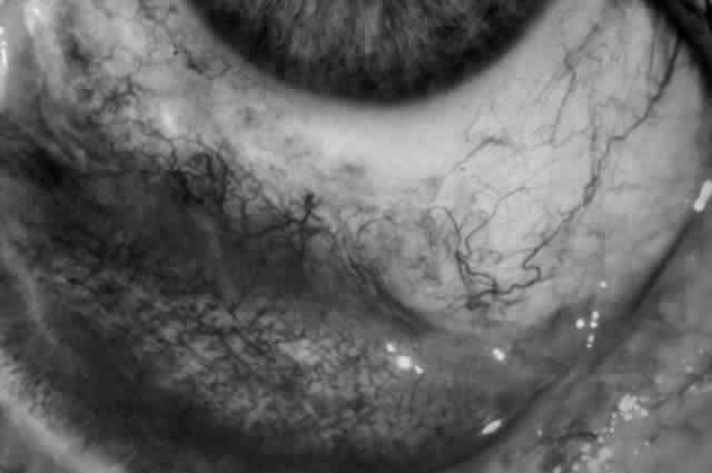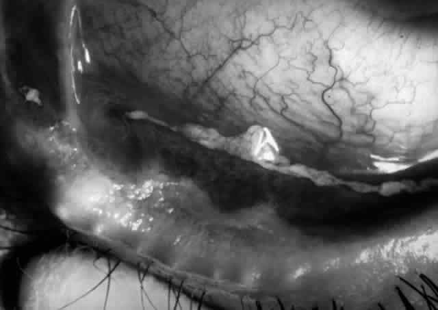 Ocular Manifestations Clinically, the ocular disease in cicatricial pemphigoid (OCP) may present unilaterally in the form of a chronic, recurrent catarrhal conjunctivitis, but it eventually becomes bilateral. Subepithelial fibrosis is characteristic of stage 1 of OCP (Fig. 7). Stage 2 shows fornix foreshortening (Fig. 8), and symblepharon formation is the hallmark of stage 3 (Fig. 9). Stage 4, end-stage disease, is characterized by ankyloblepharon and surface keratinization (Fig. 10). Obstruction of the lacrimal ductules and meibomian gland ducts eventually produces an unstable tear film and progressive sicca syndrome, but it is to be emphasized that OCP is not a dry-eye syndrome until late in the disease course.20 Trichiasis and entropion occur because of the subepithelial fibrosis, with eventual keratopathy, corneal neovascularization, and corneal ulceration and scarring.20