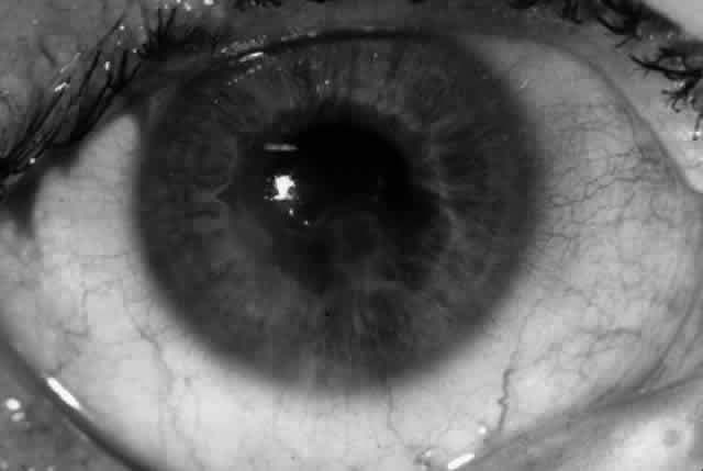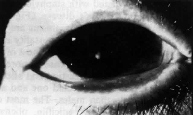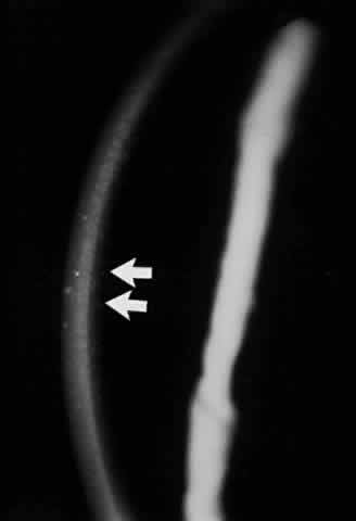 A rare, severe form of congenital autosomal recessive ichthyosis occurs in which infants are born with grotesque, deeply fissured skin and deformities of the hands and feet. This is the harlequin fetus, a condition that proves fatal, usually within 6 weeks.170 On light microscopy, ichthyosis skin lesions demonstrate thickening of the epidermis with hyperkeratosis. There is usually some degree of thickening of the granular layer, with inflammatory infiltration of the dermis. However, in ichthyosis vulgaris, the granular layer is thinned or absent and the dermis is normal. The cells of the granular layer exhibit marked vacuolation in epidermolytic hyperkeratosis. Epidemiology The incidence of ichthyosis vulgaris is approximately 1 per 300 people, and that of epidermolysis hyperkeratosis and lamellar ichthyosis is 1 per 300,000 people. The incidence of X-linked ichthyosis is 1 per 6000 males. All these varieties of ichthyosis become clinically apparent soon after birth, all are worse in winter and in dry climates, and patients have the disease for life. Pathogenesis Hyperkeratosis is the most typical histopathologic feature. The granular layer of the epidermis is absent in ichthyosis but present in X-linked and lamellar forms, and giant keratohyaline granules are present in the granular layer of the skin of patients with epidermolytic hyperkeratosis. The genetic defects at the base of the pathogenesis of the various forms of ichthyosis are undoubtedly varied, but the end result is the same, with an epidermal defect that results in increased germinative cell hyperplasia, decreased desquamation (perhaps secondary to absent detachment process), and increased keratin production. In X-linked ichthyosis, a specific enzyme deficiency (steroid sulfatase and acylsulfate C) exists, and cholesterol sulfate builds up in the epidermis. Diagnosis The diagnosis of one of the ichthyoses is based on history, clinical appearance, and the typical histopathologic features on skin biopsy. The unique histopathologic features of epidermolytic hyperkeratosis are diagnostic, and X-linked ichthyosis is diagnosed by the finding of steroid sulfatase deficiency. Ocular Manifestations Eyelid involvement in ichthyosis varies with the form of the disease. Ectropion is seen only in the lamellar pattern of ichthyosis and is the most common ocular complication in these patients, having been found in 13 of 16 patients in one series.171 This ectropion is cicatricial in nature, and it occurs predominantly in the lower eyelids, although upper eyelid involvement has been reported.172–174 Histologically, the eyelid skin exhibits typical thickening of the epidermis, with hyperkeratosis and acanthosis.175 Eyelid involvement in ichthyosis may become severe and may lead to secondary changes in the conjunctiva and cornea as a result of exposure.172 Surgery may be required for this ectropion; however, spontaneous resolution of the condition has been noted in patients with a form of congenital ichthyosis known as collodion baby. In these patients, spontaneous resolution of the ectropion may occur as the surrounding skin desquamates.174,176 There is considerable evidence to support the concept that primary corneal and conjunctival changes occur in ichthyosis. In a series of 62 patients reported by Jay and co-workers, 16 patients had characteristic corneal changes.172 Of these, 13 had sex-linked ichthyosis and 3 had ichthyosis vulgaris. None of these patients had lamellar ichthyosis, the form most frequently complicated by ectropion. Sever and his colleagues also noted corneal changes only in male patients with X-linked ichthyosis.171 These opacities were diffuse and confined to one deep layer of the cornea, either Descemet's membrane or deep stroma. The opacities were dot or filament shaped (Fig. 23). The opacities became more apparent with increasing age and were not associated with any visual loss. None of the patients with lamellar ichthyosis showed this change, but it was present in most of the female carriers of X-linked ichthyosis. Katowitz and his co-workers have reported the primary involvement of conjunctiva in ichthyosis, citing keratinization, hyperkeratosis, parakeratosis, and papilla formation as characteristic histologic features.175 Because their biopsy material was taken from the fornix region, these authors believed that the observed changes were primary in nature and not due to exposure, as others have suggested.