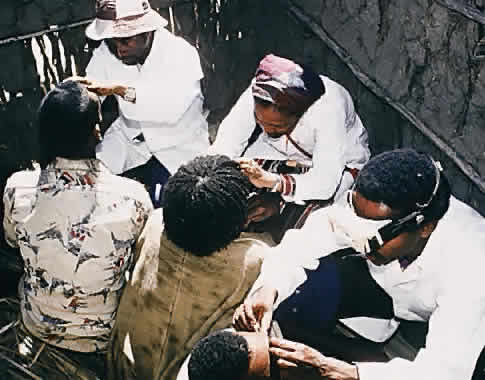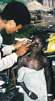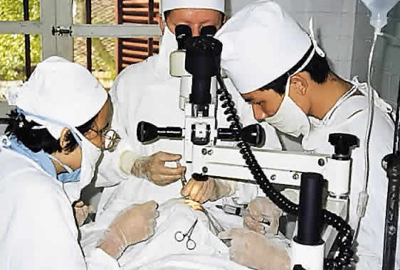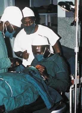 Aphakic spectacles have a limited life, and in some studies,7,39–41 up to half of the people operated on became blind again because of the loss of or damage to their glasses. Aphakic vision is magnified and has a narrow field of view with “jack in the box” effects. IOL vision simulates “normal” vision if the appropriate IOL is implanted. ICCE still is the most common method of cataract extraction in many developing nations, but ECCE/IOL is now relatively common.42–44 There are no comprehensive data on the percentage of cataract surgeries associated with IOL implantation. There are fewer serious long-term complications and better visual function and quality of life with ECCE/IOL surgery compared with ICCE and aphakic correction,45,46 but little difference in surgical outcomes between ICCE and ICCE/IOL surgery.47,48 In Africa, however, a preliminary study of anterior chamber implantation among black patients reports an unacceptably high level of persisting uveitis and other complications.49 ICCE commonly is performed without magnification, but there appears to be significantly better surgical outcomes with magnification.50 The time taken for IOL surgery is unlikely to be a rate-limiting step in the wider context of a cataract program even though the surgical time increases threefold.47,51 In retraining ICCE surgeons to perform ECCE/IOL surgery, different methods have been suggested, which include intensive short courses and in situ training; however, nonophthalmologists, including nonmedical personnel, also have been successfully trained in either ICCE or ECCE/IOL cataract surgery50,52,53 (Fig. 7). Standard-power IOLs often are used in mass programs. Several studies of IOL powers among differing populations54,55 suggest that the use of a single IOL power allows 80% of the population to be within 2.5 diopters (D) and 95% within 5.5 D of the power of the IOL required for emmetropia. One study55 found a difference of 1.0 D between male and female patients and recommends a tendency toward higher power IOLs to account for this difference when standard-power IOLs were being used. The added advantage of higher power IOLs was clearer near vision associated with the induced myopia.