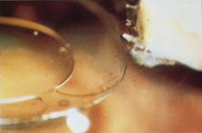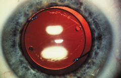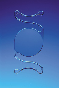 AC lenses had problems as well. Ellingson's uveitis, glaucoma, hyphema syndrome13 was associated with their use. Chronic irritation of the delicate structures of the angle caused this problem, and even without it, pain could sometimes be elicited by simply touching the eye. Later, similar rigid AC IOLs would have similar problems. Some had to do with sizing difficulties; others were problems of poor finish and the misapplication of polypropylene haptics in the AC, where they underwent ultraviolet (UV) degradation. Ultimately the flexible AC IOL was developed, most commonly the Kelman Multiflex (Fig. 5). This style of IOL features rather broad area smooth footplates, which can be placed in the angle without causing the chafe and erosion that small-sized loop-shaped haptic IOLs did. The Multiflex-type lens has provided excellent performance with similar and sometimes lower long-term corneal endothelial cell loss in secondary implantation than has the sutured ciliary sulcus posterior chamber IOL.14