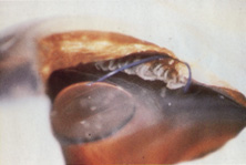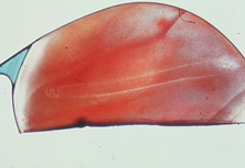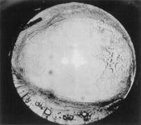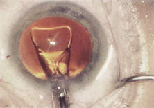 Ridley said that the cataract operation “without a replacement lens was an incomplete, only half finished operation”11 and that he would like to be remembered as the man who cured or at least initiated the cure for aphakia. He saw aphakic vision as a highly significant but unnecessary disability. Now only a memory, at least in the modern world, aphakic vision contained many disturbing visual side effects. The roving scotoma, Jack-in-the-box phenomenon, 30% magnification, distortion, loss of side vision, and extreme spectacle dependence were disabling for many patients. Because of this, even as late as the mid-1970s, surgery was typically performed only when the patient's vision decreased to 20/70 or worse in the better eye, with that eye undergoing operation 3 days after the first eye. In recognition of his pioneering efforts in IOL development and implantation, Mr. Ridley was knighted on February 19, 2000, by Queen Elizabeth II, 50 years after his first implantation. Warren Reese was the first American surgeon to perform the first IOL surgery in the United States at the Wills Eye Hospital, Philadelphia, in 1952. Mr. Ridley himself performed the first operation in America and gave the lenses to him after delivering a lecture at the Chicago Ophthalmological Society. Despite that early beginning, it would take more than 25 years for IOL implantation to become the dominant and standard accepted method of curing aphakia in the United States. The Ridley lens was placed in the posterior chamber after ECCE (Fig. 3). The anterior capsulectomy of the day was very large, and thus zonular support was poor. Some Ridley lenses dislocated into the vitreous because of poor zonular support, and partially because of their weight, which was approximately eight times that of current IOLs.