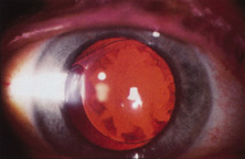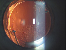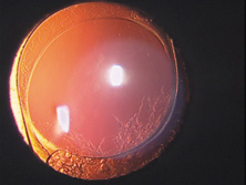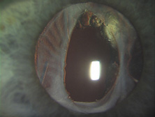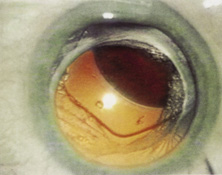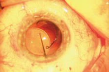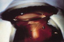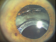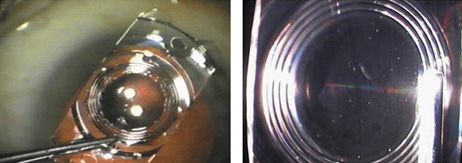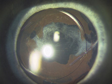Rotation of Toric Plate Haptic Silicone Intraocular Lens Plate haptic toric IOLs produced by STAAR Surgical are 11.2 mm long for powers of 22.00 D and lower. The remainder are 10.8 mm long. The day after surgery, 90% of plate haptic toric IOLs are in good position relative to the axis marked with the patient upright before surgery. Up to 10% of them have rotated enough so that their power may be affected. Only rotations of 20 degrees or more are repositioned, usually 1 week after surgery to allow some capsular reaction to take place, reducing the risk of rerotation. A 10-degree rotation reduces effective astigmatic correction by 25%, and, in a worst-case scenario, a 90-degree rotation increases astigmatism. To achieve appropriate correction, these IOLs need to have their position adjusted. Rotation may be lessened by the newer 10.8-mm diameter (up from 10.5 mm). They are available in 2.00 D and 3.50 D models, which can correct approximately 1.50 D and 2.50 D of refractive cylinder. Alcon's single-piece toric model has been shown to exhibit very little rotation.221 (Fig. 84). Pupillary Capture After normal intraocular pressure is obtained, most clear corneal incisions will eventually show signs of leakage at surgery, if they are observed long enough. A very rare patient may experience an incision leak in the hours or days after surgery significant enough to shallow the AC. This may be the result of incision imperfection or a blow to the eye. If the pupil is still dilated, it will be possible to capture the optic partially or completely. Pupillary capture implies anterior capsulorrhexis capture. Also, it would be impossible to capture the optic by the pupil unless it had escaped the capsular bag. Patients with plate haptic lenses, regardless of the status of the incision or AC depth, will have to return to sterile conditions to have their IOLs placed back within the capsular bag. For patients with C-loop haptics, if the incision is still seen to be leaking with accompanying low intraocular pressure and shallow chamber, a return to sterile conditions will be required so that the incision can be closed and the IOL repositioned. In patients in whom the incision is no longer leaking, with normal IOP and a normal depth AC, pupillary dilation and then constriction after the IOL has fallen posterior may allow appropriate pharmacologic repositioning. The IOL will still be captured within the capsulorrhexis opening, but that should be of little consequence. Substantial changes to the iris and capsular bag architecture may occur if pupillary capture goes unnoticed for some time (Fig. 85). It is important to check the IOP and examine with the indirect ophthalmoscope because a shallow chamber may be produced by choroidal effusion or suprachoroidal hemorrhage immediately after surgery. Anterior Position of Crystalens™ Atropine is given after surgery to make sure that the optic is flexed posteriorly against the posterior capsule. An anterior position, which would change functional IOL power and pseudoaccommodative performance, could occur with postoperative wound leakage and chamber shallowing. Because of this, Dr. Cumming recommends the use of a scleral tunnel incision with the Crystalens™. He also recommends the SRK/T formula for axial lengths of 22.0 mm or longer and the Holladay II formula for shorter eyes.156 Capsular Bag Distention/Capsular Block Syndrome Capsular bag distention syndrome may have several different causes. Usually seen several days to weeks after surgery, it is characterized by a distended capsular bag with the IOL optic pushed forward slightly, usually creating a low-grade myopia (Fig. 86). It has been thought that trapped viscoelastic material could trigger this phenomenon. Micropipette studies have demonstrated residual viscoelastic within the capsular bag.222 Protein production by residual epithelial cells has also been mentioned as a possible cause. Distention can be created during the final intraocular pressure adjustment and stromal hydration incision sealing procedure. Finally, a bench test model experiment has demonstrated that fluid from the AC can be pushed back behind the IOL into the intracapsular space by saccadic eye movements.223 Treatment can be accomplished with a single 1.6-mJ shot from the YAG laser, making a small opening in the peripheral anterior capsule that allows egress of the trapped fluid. Pigment Dispersion and Uveitis, Glaucoma, Hyphema Syndrome This was a more common problem in the days of ciliary sulcus placement and asymmetric placement. It could occur with both posterior and AC IOLs.220,224 It can still be observed in capsular bag placement especially in cases of zonular laxity (e.g., pseudoexfoliation). In these cases, there can be substantial iridopseudophakodonesis, which may lead to transillumination defects in the shape of the haptics (Fig. 87). Deposition of pigment occurs in the angle over the trabecular meshwork and may be associated with increased intraocular pressure. Observation of pressure and optic nerve head anatomy should be conducted regularly because the outflow channels in patients with pseudoexfoliation may have been compromised previously. Because of the iridophakodonesis, intermittent bleeding and episodes of uveitis may also be noted independent of increased pressure, and IOL exchange may be necessary. There are several reports of such complication after implantation of both single- and three-piece Acrysof® IOLs into the ciliary sulcus.225,226 The AMO Sensar with a rounded anterior edge should be better for sulcus implantation of acrylic IOLs. Post-Nd:YAG Dislocation Nd:YAG laser capsulotomy has been performed in X, cross, triangular, and circular patterns. When using one of the linear patterns, the posterior capsular opening could extend to the capsular bag equator. Because plate haptic silicone IOLs are weakly held in place by capsular fibrosis, some of these were found to dislocate into the vitreous cavity after Nd:YAG