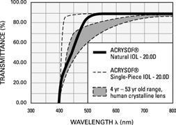 LOW/HIGH DIOPTER INTRAOCULAR LENSES STARR Surgical created low dioptric power IOLs with an overall optic diameter of 6.3 mm and overall length of 14.0 mm of 10-degree angled polyamide modified C-loop haptics (model AQ501OV). Powers available are +1.0 to +4 D in a convex/plano optic, 0 D in a plano/plano optic, and −1 to −4 D in a plano/concave optic. These can be used primarily in the capsular bag or in the ciliary sulcus as a piggyback IOL in situations in which IOL power calculation results have resulted in residual postoperative refractive error. They also have been used to physically push back the Crystalens™ optic if the optic or haptic became involved in asymmetric anterior capsular fibrosis and the fibrosis had to be physically disrupted as a secondary procedure. Similar products are available from other manufacturers, for example, the AMO:DL60L with a positive dioptric power range from 1 to 5 D and the DL60N with a minus dioptric power range from −10 to −1 D. Both of these are 13-mm overall length one-piece PMMAs. Alcon: The AcrySof® Expand® Series MA60MA is available with a diopter range from +5.0 to −5.0 in whole diopter steps and 13.0-mm overall length. Bausch and Lomb: The P574UV and BVR165XL are available in −18 D to +3 D in whole diopter steps. Models P359UV and P389UV are available in plano to +45 D in half diopter steps. These are all single-piece PMMA lenses of 13.0 mm overall length. The three-piece silicone LI61AO is available in positive dioptric powers: 0 to 4.0 D in whole diopters and 5.0 to 30.0 D in 0.5 diopters. LIGHT-NORMALIZING INTRAOCULAR LENSES Background Concerns about human eye retinal damage by UV radiation emerged because of the results of animal light toxicity studies in the late 1970s.77–79 This awareness stimulated the IOL industry to develop ultraviolet radiation (UVR)-filtering (300–400 nm) IOLs, especially because there should be no downside, that is, UVR did not contribute to vision. But, when these IOLs were introduced in the early 1980s, questions were raised regarding toxicity of the UVR-filtering chromophore80 and its potential for long-term leaching and possible release during Nd:YAG laser posterior capsulotomy. Unproven stability, safety, and lack of clinically demonstrated benefit of safety for these IOLs added to initial skepticism. The U.S. FDA testing for of the new UVR-filtering material addressed these concerns, as did demonstration of protection by such filtering in animal experiments.81 Human studies82,83demonstrated a need for protection from UVR. As a result, by the mid-1980s, virtually all manufacturers decided to offer only IOLs with an incorporated UVR-filtering chromophore. In 1978 Mainster78 discussed retinal damage from intense near-UVR light sources after providing measurements of a non–UVR-filtering PMMA IOL and comparing it with that of human crystalline lens data from the literature.84 He recognized the need for tinting IOL material. But because of the excellent visual results of non-blue light-filtering IOLs at that time, and to avoid new materials, he suggested continued formulation of permissible exposure levels of UV radiation and continued counseling pseudophakic patients about possible occupational or environmental hazards to excessive visible light. Zigman79 supported yellow tinting of IOLs, citing his own earlier experiments in animals, which showed retinal damage even with non-intense near-UVR sources. He cited references85,86 on the yellow color of the crystalline lens of several species including human. He gave other circumstances such as light sensitivity, exposure to light sensitizing drugs, and excessive glare, for which he suggested tinting of IOLs. He even created light-normalizing PMMA by a degradation process with UV radiation on an existing IOL material and IOLs made from it.87 In 1983, Sliney88 reported that removing wavelength of light less than 500 nm would filter out only 10% of useful visible light but would remove 97% of harmful UV and blue radiation. In 1985, Marshall reviewed the issues of radiation and the aging eye89 and suggested tinted IOLs so that they would transmit light in similar fashion as the natural human lens. Filtering of UVR and blue light for pseudophakic eyes was also suggested in 1986.90,91 Similarly in 1987 Mainster92 reviewed the possible link between light and macular degeneration and recommended UVR and deep blue protective sunglasses for aphakes and pseudophakes without any blue light-filtering IOL as precaution until the relationship between photic retinopathy and age-related macular degeneration (AMD) might be better understood. In addition to these studies, animal electroretinography (ERG) research,93,94 laboratory lipofuscin fluorophore A2E assessments,95 and human vitreous autofluorescence and fluorophotometry96 all suggest a potential benefit by reducing the amount of blue light overexposure experienced in UV-filtering IOLs. In 1987, Young97 wrote a review on pathophysiology of AMD and followed up next year with a review98 on the hypothesis that solar radiation plays a key role in AMD and suggested both antioxidants and protective radiation filters be intrinsic components of a program of preventive medicine. As of 1988, it was recognized that although the need for sunglasses in very bright sunlight could not be met by an IOL, at least filtering as much as possible damaging UV and blue light for all light conditions in pseudophakic eyes might be reasonable. Anil Patel, PhD, was the chief scientist at CooperVision in the early 1980s and contributed significantly to the development of UVR blocking and blue-light attenuating IOLs. At CooperVision he also worked on phototoxicity safety issues for its Argon laser delivery system for retinal photocoagulation. He had become part of the CooperVision organization through its acquisition in 1979 of the dental company Cavitron (New York). Before the acquisition, he made presentations to the FDA about phototo