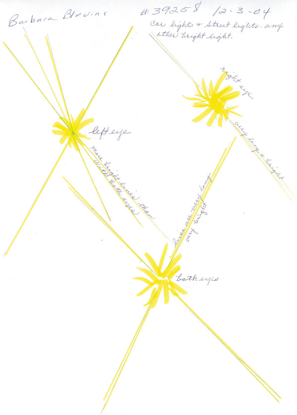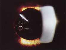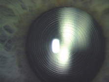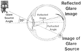 With most of the lenses, the onset of the opacification occurred from 6 months to years past the operation; the lens opacifications have occurred in only a handful of lenses. This has, unfortunately, at present served to give this material a poor reputation. Virtually all problems seen were based on faulty manufacturing, either at the time of formation of each company's polymer or during fabrication and packaging of the lens. For example, a hydrophilic acrylic material manufactured by Rayner Corporation has been implanted in approximately 1 million cases in 5 years with no report of primary calcification (data in file at Rayner Corporation). Pseudophakic Dysphotopsia The potential for flare, streaks, halos, shadows, and other abnormal visual perceptions239 in the pseudophakic patient (termed pseudophakic dysphotopsia (Olson RJ: IOL exchange to correct severe glare in 5.5 mm AcrySof patients. Presented at the Symposium on Cataract, IOL and Refractive Surgery, San Diego, CA, April 1998) have been present in every IOL design since Ridley's first implantation in 1949. The phenomenon is increased in incidence and severity by the use of small-diameter optics or truncated ovoid optics.60,240–245 Pseudophakic dysphotopsia is underdiagnosed because many patients will tolerate mild to moderate symptoms without ever saying much of anything about them. Other patients are more persistent in their willingness to articulate their experiences, which makes it easier to diagnose pseudophakic dysphotopsia. Some patients feel absolutely possessed by their visual distractions and find them virtually unbearable. If asked about them in a specific questionnaire, 20% of pseudophakic patients will report some type of abnormally imaged side effect.240 Although sometimes severe, these symptoms have usually been transient and clinically insignificant. However, these abnormal secondary perceptions attained contemporary interest because of their apparent increased incidence and severity in the very popular AcrySof® IOL.134,221,246–263This continues to be a reason for IOL exchange in a small but significant number of patients with this lens design and in patients implanted with similar designs as well. The dysphotopsia can be divided into “positive,” bright spots and streaks (Fig. 93),240 and “negative,” straight or slightly curved temporal dark shadows that appeared to be dark to the patient (Fig. 94).260 The combination of high refractive index hydrophobic acrylic material, square edge, and relatively flat anterior surface is especially prone to this complication. The square edge, which is a key feature in reducing central epithelial proliferation and resultant PCO, has been incriminated in a ray tracing analysis study. The internal reflection from the IOL edge diverts light rays to the opposite retinal field, casting a shadow where they otherwise would have struck the retina (Figs. 95 and 96).134 Other ray-tracing studies found that the relatively flat anterior surface of the high index refraction IOL may contribute to dysphotopsia.251,258An external light source at approximately 1 to 25 degrees to the optical axis can result in an internal surface reflection that is round or oval in shape and occurs with pupil sizes as small as 3.2 mm (Fig. 97). Alcon engineers responded with three key design modifications that were ultimately introduced in its single-piece models and later in its MA30AT and MA60AT three-piece models to improve optical performance. First, the power curves of the optics were reversed so that the relatively flat 5.5 D, which had defined the anterior surface, was placed on the posterior surface with the relatively more round dioptric power curve on the anterior surface. Second, the edge was modified in a proprietary process so that it was rendered antireflective (Fig. 98). And third, the edge was thinned to 0.22 mm from its immediately preceding 0.3 mm on the MA30AL and MA60AL (it was 0.4 mm thick at its introduction on the MA60AL) (personal communication, Alcon Surgical, November 2002).