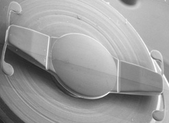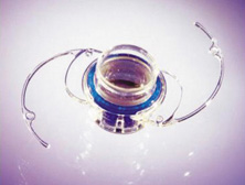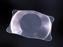 Two basic models are available. For partial iris damage, a ring with one black segment added to it can be implanted to cover the damaged area. For extensive iris damage, a multisegmented ring is available. One should always remember that other noninvasive solutions such as colored contact lenses and tattoos are possible. Ophtec (Groningen, The Netherlands) manufactures iris reconstruction implants as well. PSEUDOPHAKIC INTRAOCULAR LENSES FOR VERY SMALL INCISIONS The advent of microincision surgical techniques rendered cataract removal through clear corneal incisions as small as 1.1 to 1.6 mm possible. The natural consequence of this advance is the development of IOLs that can be inserted through such small incisions. UltraChoice™ ThinLens The UltraChoice™ ThinLens is not available in the United States. ThinOptX (Abingdon, VA) received CE Mark approval for the UltraChoice™ monofocal cataract lens on September 9, 2002. One of the recently developed lenses that can be inserted through a sub–2.0-mm incision (1.45-mm) is the UltraChoice 1.0 Rollable™ ThinLens (ThinOptX) lens (Fig. 60). It is manufactured from a hydrophilic acrylic material with 18% water content. The refractive index of the material is 1.47. The dioptric power of this lens ranges from +15 to +25 D, as of April 2003. The optical thickness is 300 to 450 μm, with a biconvex optical configuration having a meniscus shape. The overall diameter of the lens is 11.2 mm, and the optical diameter is 5.5 mm.