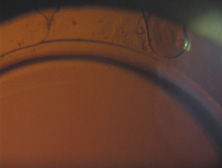Optic Damage PMMA optics may be scratched, silicone optics torn, and acrylic optics slightly cracked during implantation. Care in handling the optic is key. Proper loading of injectors is important, but even if well done by experienced doctors, technicians, and nurses, tears in delicate silicone are possible. Acrylic lenses should be folded slowly and carefully at approximately room or body temperature. It is possible to damage the central acrylic optic if folded too sharply for too long.216 Damage can also occur in silicone optics during the unfolding process.217 Of course, all instruments should be cleaned and polished free of debris before optic contact, or debris may be imprinted onto the optic. The Monarch injector by Alcon gently curls the acrylic optic, avoiding the acute folding required by instruments. The chance for optic trauma is higher if the lens is tightly rolled in the distal cartridge for a longer time.61 Optic torque has been found to be less if a dispersive viscoelastic such as Viscoat was used during the injection process.218 In general, if defects are small and peripheral, they may be tolerated: The risk of exchange is greater than the risk of leaving them in place. If the tears are substantial and may affect vision or structural performance, the IOLs need to be exchanged. PMMA lenses can simply be removed as they were implanted. Silicone lenses may be divided with scissors and removed (Fig. 78), whereas acrylic IOLs may be refolded within the eye and then removed from the original incision (Fig. 79).57