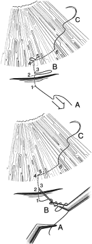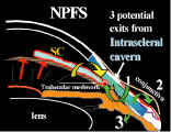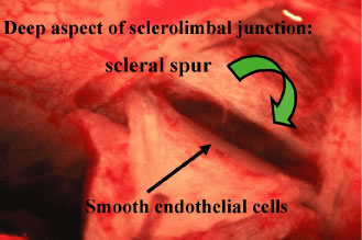 Both nonpenetrating procedures are designed to decrease outflow resistance not eliminate it, as may uncontrollably occur with standard filtration surgery. In generic terms, NPFS consists of fashioning dual scleral flaps (Fig. 20) with removal of the deep flap (deep sclerectomy) leaving an internal limiting membrane and an intrascleral aqueous reservoir. More specifically, the intrascleral space and ostia of Schlemm's canal are filled with viscoelastic in viscocanalostomy or a collagen wick placed in the intrascleral space as in DSCI.104 Prospective studies comparing DSVC to standard filtration surgery reveal greater pressure reduction with trabeculectomy.105 Thus, patients with severe glaucomatous damage, especially exposed to long-term topical therapy, are more likely to benefit from standard filtration techniques. Another study comparing deep sclerectomy with and without collagen implant to trabeculectomy found comparable results between the procedures.106 How does NPFS fit into our incisional options? At this time, it is difficult to sort out the best candidates for NPFS. Each new case adds a piece to the puzzle of how these procedures truly work and who will most likely benefit. Results from a black African population are encouraging107 but have not been reproduced in other patient populations. Can we directly extrapolate the same technique to different populations with dissimilar types of glaucoma, years of topical therapy, and variable outflow pathology? A recent study reveals NPFS in patients with primary open-angle glaucoma was more effective in patients without prior medical therapy than in patients on years of topical medical therapy.108 Glaucoma medications may cause changes in the conjunctiva and episcleral that lead to failure in any type of filtration procedure,109 possibly more detrimental for nonpenetrating procedures. The learning curve for NPFS procedures is very steep, much like trabeculotomy in an infant eye. A review of outflow anatomy is crucial before nonpenetrating procedures (Fig. 21). DSCI and DSVC are headed down two competing pathways, one with internal filtration and the other with external filtration. External filtration as seen in DSCI still produces a bleb. Bleb formation with viscocanalostomy is minimal although microcysts may form above the 300-micron scleral flap. The proposed mechanisms of IOP reduction for NPFS are seen in Figure 22. Direct intraoperative evidence for enhancement of outflow facility can be seen during DSVC. Observation of this phenomenon has caused a renaissance in outflow surgery (Fig. 23). Patient selection for NPFS is more complicated than for standard trabeculectomy. Patients with significant complications from prior trabeculectomy or at high risk for failure may be candidates for NPFS. The problems with nonpenetrating procedures are unique and require a completely different set of preoperative, intraoperative, and postoperative thought processes and skills compared with trabeculectomy or trabeculotomy. Preoperative Considerations