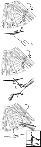 To avoid an excessively low IOP, surgery is designed so that the IOP is, hopefully, around 15 to 25 mm Hg in the immediate postoperative period; methods of achieving this are detailed in each of the sections on surgical technique. However, just as excessively low IOP is to be avoided, the surgeon must also be sure that the IOP is not so high that it will cause rapidly continuing damage postoperatively. Thus, checking the IOP soon after surgery is highly recommended. Ideally the IOP should be checked around 2 to 3 hours postoperatively to ensure that the eye is not hypotonous or that the IOP is not too high. If the eye is too soft, the patient must be cautioned regarding activity. If the eye is too hard, then appropriate steps must be taken at that point. A CTM may be all that is needed, or in some cases other steps may be necessary. Gonioscopy is essential to ensure that the sclerostomy is patent. The indications for and the timing of suture release or suture cutting is a vitally important part of postoperative care. Cutting the sutures too soon leads to complications, too late leads to failure. Several methods for tying releasable sutures have been proposed. The one that we have found most satisfactory is illustrated in Figure 7. The principle is the same for incisions of all directions. The suture is placed over the incision to be closed, and then the needle is passed under the area in which the conjunctiva will become adherent to the cornea. The needle is then exteriorized on the corneal side of the conjunctiva and buried in the conjunctiva so that it will not cause symptoms. The suture is released by grasping the loop on the cornea and by pulling slowly and continuously towards the chin. Despite selection of a proper procedure and use of a proper technique, complications still occur. Recognizing the complication and correctly diagnosing the cause is the first step towards handling the complication appropriately. Guidelines are shown in Table 23. SPECIFIC COMPLICATIONS Flat Anterior Chamber The risks versus the benefits of glaucoma surgery have been discussed (see Table 1). The more common complications are listed in Table 32. One of the most troublesome complications is flatness of the anterior chamber after surgery. The flat anterior chamber may result from many different physiologic mechanisms, as indicated in Table 23.