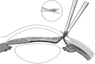 After the iridectomy is complete, the iris usually will return spontaneously into the anterior chamber unless it has suffered damage as a result of high pressure (as occurs in severe attacks of angle closure glaucoma). In patients with a reactive sphincter, it usually is necessary only to release the iris from the grasp of the incision. The iris can be stroked into position with the use of a blunt instrument on the corneal surface. Attempting to reposit the iris by directing a stream of irrigating solution into the incision is not recommended; the solution may enter the posterior chamber, forcing even more iris out of the incision. If the surgeon has difficulty restoring the iris to its proper position, injection through the previously placed paracentesis track of freshly mixed acetylcholine usually will solve the problem. In the eye with a dilated fixed pupil and a flaccid iris, it often is preferable to perform a sector iridectomy. Once the pupil is entirely round, the suture placed previously in the corneoscleral incision can be pulled up and secured promptly. Injecting balanced salt or acetylcholine solution through the previously placed paracentesis can deepen the chamber. In patients who have had recent angle-closure attacks and in whom peripheral anterior synechiae may be newly developed, forceful deepening of the anterior chamber at this point may tear open the synechiae and restore normal function of the anterior chamber. The procedure of chamber deepening must be done cautiously, with careful monitoring of IOP. A gonioprism, such as the Zeiss four-mirror lens, can be used with an operating microscope to monitor the effect on anterior chamber angle. At the close of the procedure, the pupil should be round, the chamber deep, and the incision sufficiently closed that there is no leakage. The IOP should be approximately 15 to 30 mm Hg, being raised to that level by injection through the keratostomy. Such a pressure may help prevent subsequent choroidal detachment and allows the integrity of the incision to be tested. If the corneoscleral incision has been properly placed and sutured, there should be minimal transient astigmatism. Vision should return to the preoperative level within several days. If the eye is inflamed, it usually is helpful to instill a short-acting cycloplegic agent such as cyclopentolate. Furthermore, the surgeon may give a subconjunctival injection of corticosteroid, although it rarely is necessary to do so. An antibiotic ointment and a light patch usually are applied until the facial nerve block has worn off. If there is a reasonable chance that the patient will need a filtration procedure at a later date, then the surgical procedure is modified to perform the iridectomy through clear cornea, rather than under a fornix-based flap. The technique is almost exactly the same, with the obvious exception that the incision is placed through clear cornea. Postoperative Care In almost all instances, iridectomy can be performed as an outpatient procedure. However, when associated with severe pain or when the attack of angle closure has been difficult to stop and has required extensive usage of carbonic anhydrase inhibitors and osmotic agents, admission of the patient to the hospital may be justified. Especially in older and infirm patients, the general state of health must be monitored carefully. It is important to verify that the patient has not become overly dehydrated or experienced an attack of congestive failure. The eye patch usually is removed from the treated eye as soon as the facial nerve block has worn off. If the procedure is done on an outpatient basis, a patch and shield may be left in place until the patient returns the next day for the first postoperative visit. A drop containing a corticosteroid can be used topically three or four times a day until the inflammatory response has disappeared, usually 4 to 7 days. Careful attention must be paid to the state of the pupil. The development of posterior synechiae is an important and usually unnecessary complication. Although it is not clear that posterior synechiae predispose the patient to the development of cataract, the presence of such adhesions makes extracapsular cataract extraction more difficult. Because many patients with angle-closure glaucoma will later have cataract extraction, the development of such adhesions may jeopardize the long-term visual result. Furthermore, inability of the pupil to dilate in the dark may limit the patient's visual function, especially in conjunction with a developing cataract. In most cases, dilating drops are used routinely until the inflammatory response has worn off. One acceptable program is to use tropicamide 1% at sufficient intervals to ensure that the pupil is dilated adequately for a period of approximately 1 week. The medication can be continued at bedtime for 2 to 3 weeks, or even longer, until it is certain that the inflammatory response has disappeared. Many patients are given pilocarpine preoperatively. There is a tendency to continue the administration of pilocarpine postoperatively, especially when control of IOP has been difficult. This practice should be discouraged. Pilocarpine will predispose patients to posterior synechiae and should be avoided if possible. The drug of choice for pressure control usually is topical epinephrine, a β-blocker, or epinephrine plus a β-blocker. If these two agents are not adequate, a carbonic anhydrase inhibitor can be used until the eye is entirely quiet, at which time pilocarpine can be reinstituted. In such cases, however, care should be taken to dilate the pupil periodically to prevent the development of posterior synechiae. Some surgeons may be reluctant to use dilating drops for fear of inducing angle closure. This possibility exists, but it is uncommon. Furthermore, it is preferable to know immediately whether the iridectomy has eliminated the possibility of angle closure caused by papillary dilatation. Therefore