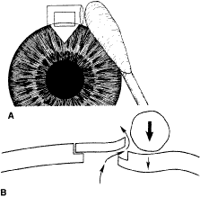 Once the anterior chamber is maintaining a well-formed condition, long-acting cycloplegic agents, such as atropine, can be discontinued. As soon as the intraocular inflammation begins to resolve, the topical steroids can be tapered, and, in most cases, they should be discontinued within 3 weeks of surgery. Longer usage predisposes patients to cataract and steroid-induced glaucoma. Systemic steroids are used by some surgeons, and they may increase the success rate arid tend to produce an eye with a thin, polycystic bleb and a low final IOP. The complications of systemic steroids, however, are significant, and must be taken into account. One of the most helpful maneuvers after a guarded filtration procedure is the CTM,58 which is shown in Figure 16. This technique of applying pressure in a localized fashion directly over the radial edge of the scleral flap is appropriate for guarded filtration procedures that are performed so that the scleral flap overlies a small edge of underlying cornea and sclera. Localized pressure at the radial edge of the flap deforms the edge, disrupting the union between the overlying scleral flap and the underlying corneosclera. Thus, gentle pressure will encourage aqueous to flow through the radial edge of the scleral flap unlike the technique that has been used for generations to encourage aqueous to flow out of a sclerostomy.54 This technique involves pressing oh the globe, which increases the IOP and causes the underlying sclera and cornea to be pushed up against the overlying scleral flap, making the apposition between these two tissues even tighter. Thus, this technique does not work well in patients who have had a guarded filtration procedure and may be more likely to force iris into the internal ostomy opening. The CTM is performed by anesthetizing the eye well with several instillations of proparacaine 0.5%.58 A sterile, cotton-tipped applicator is soaked with the anesthetic agent. With the patient observed at the slit lamp, the upper lid is lifted, the patient is asked to look down, and gentle pressure is applied with the tip of the applicator directly over one of the radial grooves of the scleral flap. This maneuver should be associated with immediate shallowing of the anterior chamber, development of a high bleb, and fall of IOP. If these changes do not occur immediately, the applicator is placed over the other radial incision, and pressure applied. It may be necessary to try several locations until the spot is found where pressure will cause deformation of the incision arid result in encouraging filtration. The CTM should be done gently. In our hands, it has not been associated with complications. It may be repeated three or four times daily for the first 3 or 4 days to encourage the development of a patent fistula. After 2 weeks or so, it probably will not have a permanent effect on the outcome of surgery. We often use the CTM in the early postoperative period. However, we do not believe in long-term continued use of massage or pressure of any kind. In our opinion, this pressure is traumatizing to the eye and rarely results in an improvement in the long-term result. When CTM does not re-establish satisfactory filtration or when the IOP remains higher than the surgeon has hoped and filtration is inadequate, it often is helpful to release one of the 10-0 nylon sutures in the scleral flap by burning the suture transconjunctivally with an argon laser. A small lens is used to flatten the conjunctiva. We use the lens designed by Hoskins.54 The edge of the Zeiss four-mirror lens also may be used. The Hoskins lens compresses the conjunctiva, making a suture in the sclera easily visible. The suture can be burned with a spot size of 50 μm, an exposure time of 0.1 second, and a power of 300 to 700 mW, using the blue or green light of the argon laser. Depending on the laser and the surgeon's technique, more or less power may be necessary. In most cases, one or two applications with a laser will burn through the suture, allowing it to retract and releasing traction on the incision. In many instances, a bleb develops immediately, and IOP falls. Several sutures may need to be released to obtain adequate filtration. As mentioned earlier, when the surgeon plans to release sutures with a laser, a 10-0 nylon suture can be placed in the middle of the posterior edge of the flap so that there is no excessive filtration when sutures are released. In the presence of subconjunctival blood, there is a significant risk of conjunctival burns or holes. Use of the red krypton laser reduces absorption by blood and increases the success of suture lysis in the presence of subconjunctival blood. The management of complications is covered in the third section of this chapter. TRABECULOTOMY Trabeculotomy is useful for managing congenital glaucoma where Schlemm's canal can be identified. Although goniotomy is the procedure of choice in infants or children with congenital glaucoma in whom the cornea is sufficiently clear to allow the surgeon to see into the anterior chamber angle, trabeculotomy is a satisfactory second choice, and it is the preferred procedure where the cornea is hazy. It is of value in the secondary glaucomas as well, especially the open-angle inflammatory glaucomas, such as those seen in association with Still's disease. The procedure demands high magnification; it is best done with an operating microscope. The initial portion of the operation is virtually identical to a guarded filtration procedure (Fig. 17; see also Fig. 15). A fornix-based or limbus-based conjunctival flap is developed at the 12 o'clock position. A scleral flap approximately 4 × 4 mm is fashioned, hinged at the limbus (see Fig. 13A). This flap, however, differs from a guarded filtration procedure flap in that it should be thicker; whereas a trabeculotomy flap ordinarily is one third to one fourth the thickness of the sclera, when performing a trabeculotomy, the scleral flap should be two thirds t