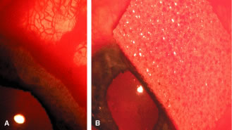 Hypotony may be due to a high outflow state and/or choroidal effusion with hyposecretion. If there is a profound wound leak, it may need to be repaired. If the anterior chamber has shallowed with a risk of cornea to lens touch, then reformation of the anterior chamber with a viscoelastic and possible choroidal effusion drainage may be required. Temporarily tying off the tube completely in nonvalved shunts may be necessary in certain cases to help resolve persistent hypotony. LATE POSTOPERATIVE PERIOD. After several weeks if there is an elevation of eye pressure there are several possible etiologies: bleb encapsulation, steroid response, excessive subconjunctival fibrosis, or occlusion of the tube tip (Fig. 52). At about 1 month after surgery, there is often an IOP rise despite a large, thick bleb overlying the reservoir indicating an encapsulation phase (Fig. 53). This often resolves with conservative management with glaucoma medication. However, needling of the bleb or surgical revision with partial excision of the bleb wall may be required in resistant cases.137 Eye pressure elevation secondary to steroid responsiveness138 may be handled by switching to a less potent steroid, tapering off the topical steroid, or switching to a topical nonsteroidal agent to suppress inflammation. Failure of the tube shunt because of conjunctival scarring may require another surgical intervention such as a second tube shunt in another site or cyclophotocoagulation.139 If the tube tip is enveloped by a fibrous sheet or iris synechiae, it may be re-opened by YAG laser application.140 Often the tube tip must be repositioned to another entry site. With direct cornea or lens apposition with the tube, corneal decompensation or cataract development will ensue. Repositioning of the tube should be promptly performed at the earliest sign of localized corneal edema. Eyes with corneal grafts are of greatest concern because of potential danger to the graft.141 The large posterior blebs seen with shunts may mechanically limit globe movement and result in diplopia.142 If present in the primary position, prisms may resolve the problem, but some patients may require strabismus surgery or even removal of the shunt. Despite use of a patch graft, the tube may erode through the graft and conjunctiva143 (Fig. 54). Repair must be undertaken because there is a serious risk of intraocular infection. Insertion of another patch graft and reapproximation of the overlying conjunctival defect is usually successful. Extrusion of the reservoir is a more serious and difficult problem to solve satisfactorily (Fig. 55). Closure of the conjunctival defect is hard to maintain, and typically removal of the shunt is necessary. Placement of another shunt at another site should be considered.