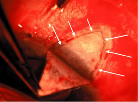 TUBE ENTRY. The tube is trimmed so that there is a bevel facing anteriorly and 2 to 3 mm will appear within the anterior chamber. After scrutiny for the ideal tube entry site, a 23-gauge needle is passed through the limbus to create a tight entry site. The tube tip should not be touching either the cornea or lens. Alternatively, a pars plana entry could be considered if a pars plana vitrectomy has been performed.134 After reforming the anterior chamber with balanced salt solution, the valved shunts should allow for fluid runoff. If the unvalved tube has been tied tightly so that there is no flow, 1- to 2-mm venting slits are made with a microblade within the tube proximal to the external ligature. This will allow for some outflow through the tube in the early postoperative period. RIPCORD SUTURE PLACEMENT. For the nonvalved shunts, the 4-0 nylon intraluminal suture is passed into the subconjunctival space of an adjacent quadrant (usually inferotemporally). This allows for easy removal postoperatively to fully open the tube for aqueous outflow. WOUND CLOSURE. A donor patch graft is placed over the tube to reduce the risk of tube erosion through the conjunctiva135 (Fig. 50). Potential donor materials include: sclera, fascia lata, and pericardium. The conjunctiva is repositioned to carefully cover the tube and overlying patch graft. For a limbal-based conjunctival flap, a two-layered closure of Tenon's layer and then conjunctiva is recommended.